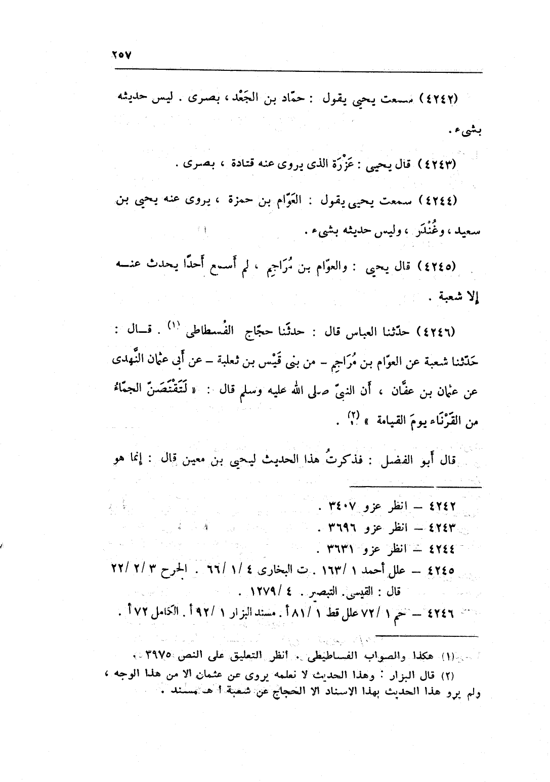 4246 - حَدثنَا الْعَبَّاس قَالَ حَدثنَا حجاج الفسطاطي قَالَ حَدثنَا شُعْبَة عَن الْعَوام بن مراجم من بنى قيس بن ثَعْلَبَة عَن أبي عُثْمَان النَّهْدِيّ عَن عُثْمَان بن عَفَّان أَن النَّبِي صلى الله عَلَيْهِ وَسلم قَالَ لتقتصن الْجَمَّاء من القرناء يَوْم الْقِيَامَة قَالَ أَبُو الْفضل فَذكرت هَذَا الحَدِيث ليحيى بن معِين قَالَ إِنَّمَا هُوَ أَبُو عُثْمَان عَن سلمَان فَقلت لَهُ مَا نقُول فِي الْكتاب عَن الْحجَّاج قَالَ نعم فَاكْتُبْ عَنهُ فَإِنَّهُ شيخ لَا بَأْس بِهِ