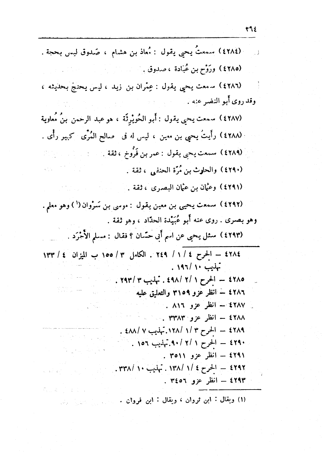4292 - سَمِعت يحيى بن معِين يَقُول مُوسَى بن سروان وَهُوَ معلم وَهُوَ بَصرِي روى عَنهُ أَبُو عُبَيْدَة الْحداد وَهُوَ ثِقَة