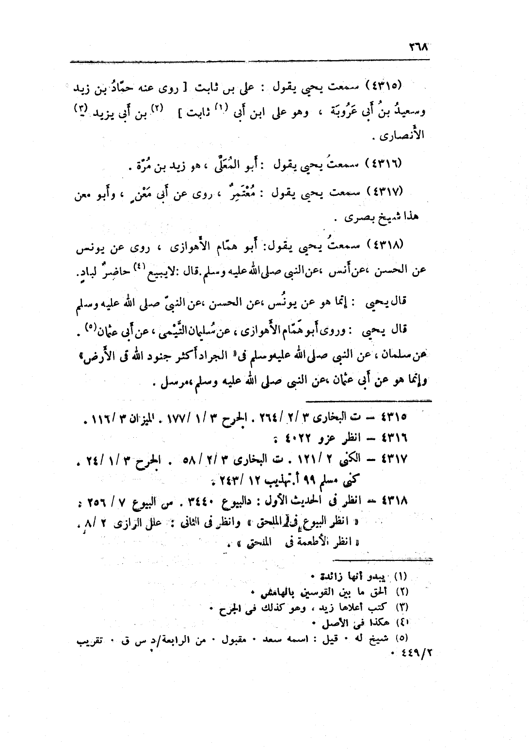 4318 - سَمِعت يحيى يَقُول أَبُو همام الْأَهْوَازِي روى عَن يُونُس عَن الْحسن عَن أنس عَن النَّبِي صلى الله عَلَيْهِ وَسلم قَالَ لَا يَبِيع حَاضر لباد قَالَ يحيى إِنَّمَا هُوَ عَن يُونُس عَن الْحسن عَن النَّبِي صلى الله عَلَيْهِ وَسلم قَالَ يحيى وروى أَبُو همام الْأَهْوَازِي عَن سُلَيْمَان التَّيْمِيّ عَن أبي عُثْمَان عَن سلمَان عَن النَّبِي صلى الله عَلَيْهِ وَسلم فِي الْجَرَاد أَكثر جنود الله فِي الأَرْض وَإِنَّمَا هُوَ عَن أبي عُثْمَان عَن النَّبِي صلى الله عَلَيْهِ وَسلم مُرْسل قَالَ يحيى أَبُو همام لم يكن صَاحب حَدِيث وَلَكِن لَا بَأْس بِهِ