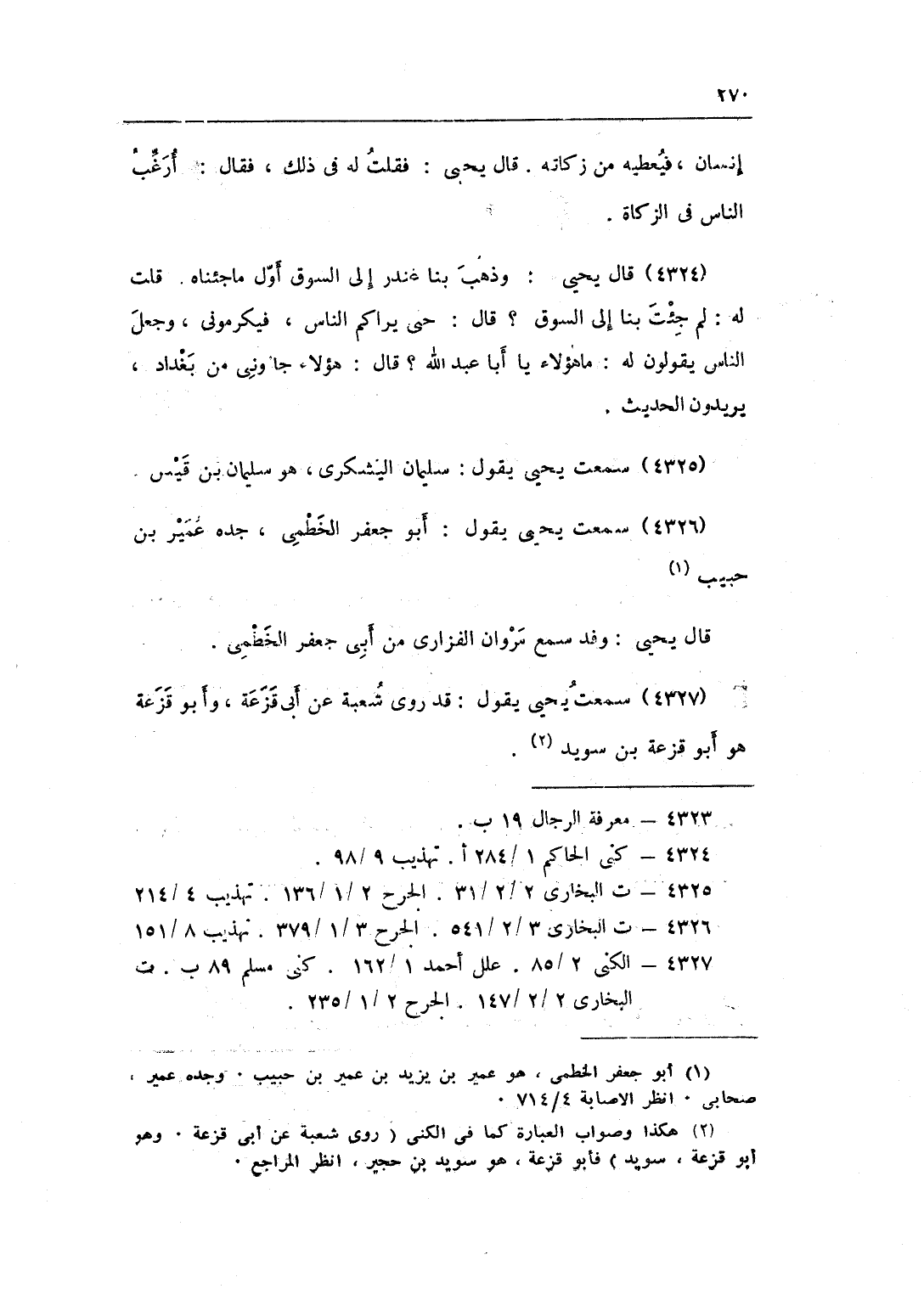 4326 - سَمِعت يحيى يَقُول أَبُو جَعْفَر الخطمي جده عُمَيْر بن حبيب قَالَ يحيى وَقد سمع مَرْوَان الْفَزارِيّ من أبي جَعْفَر الخطمي