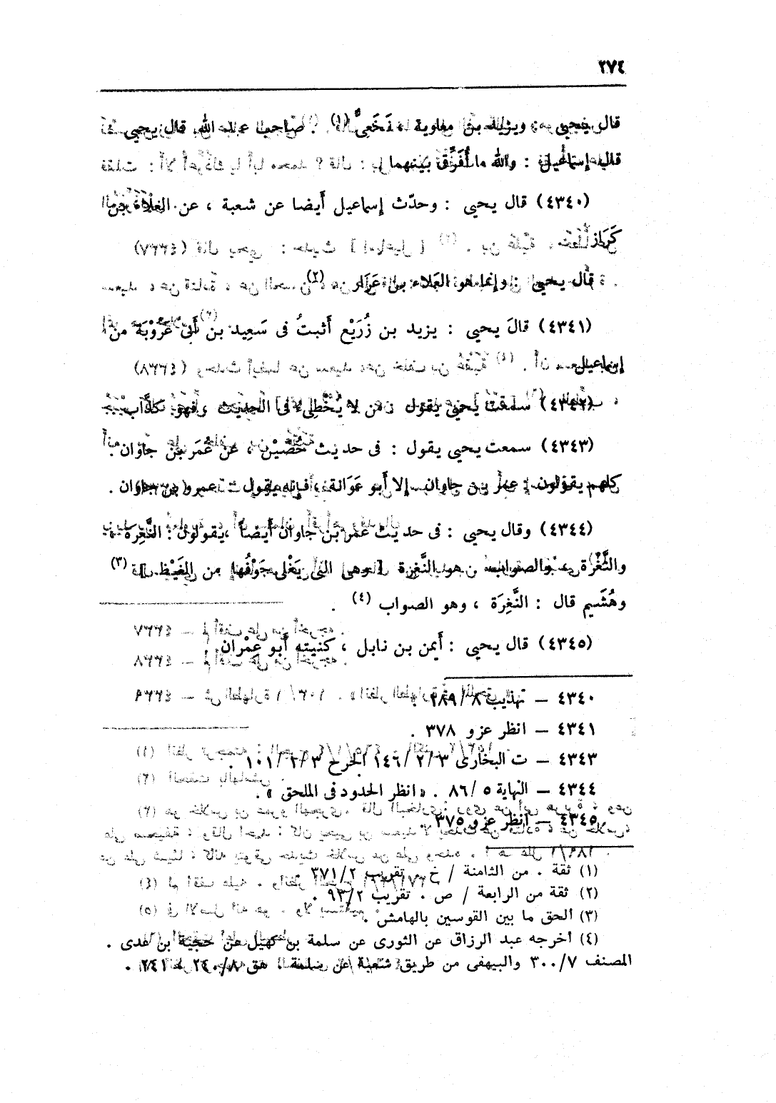 4340 - قَالَ يحيى وَحدث إِسْمَاعِيل أَيْضا عَن شُعْبَة عَن الْعَلَاء بن كراز قَالَ يحيى وَإِنَّمَا هُوَ الْعَلَاء بن عرار