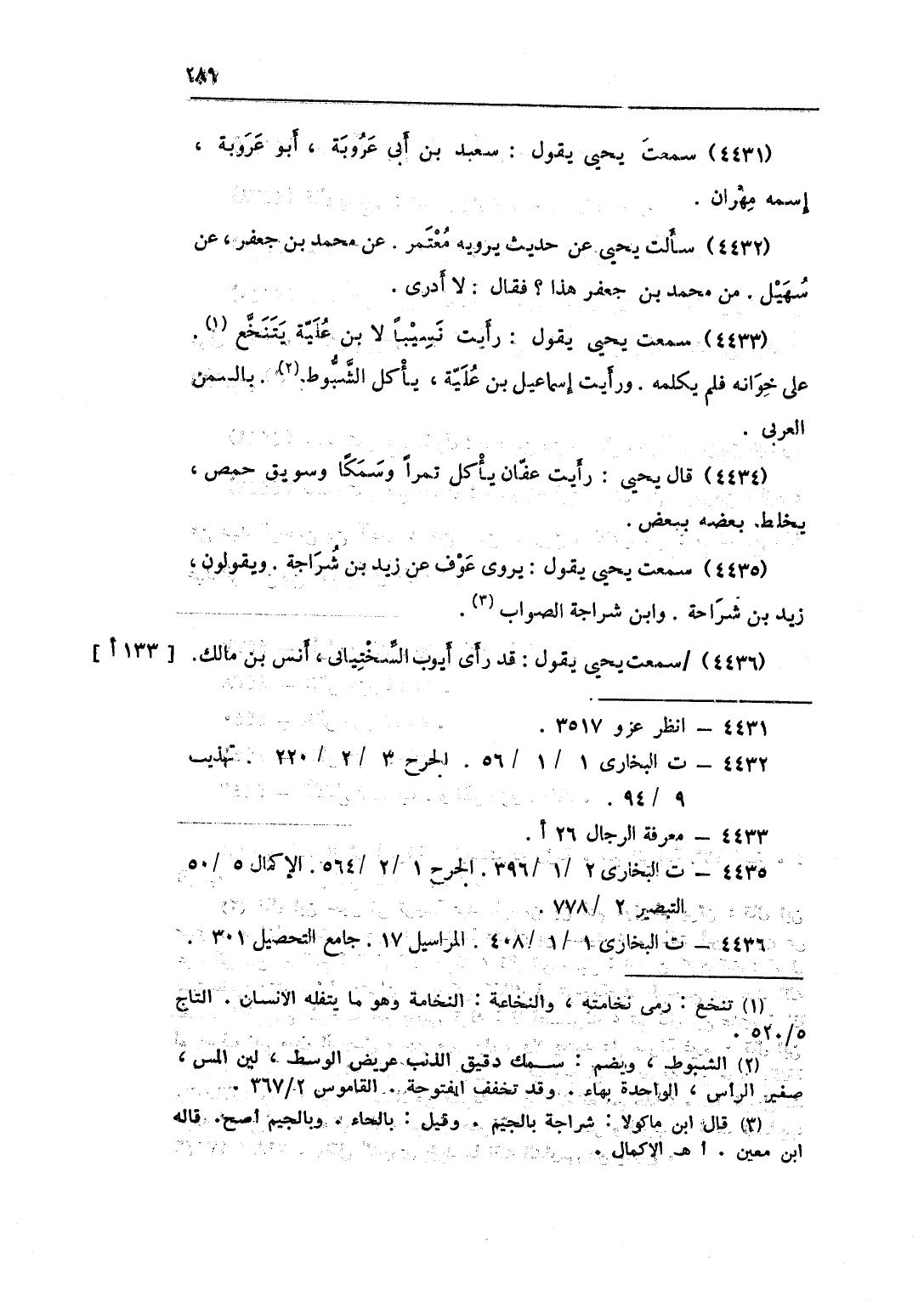 4433 - سَمِعت يحيى يَقُول رَأَيْت نسيبا لِابْنِ علية يتنخع على خوانه فَلم يكلمهُ وَرَأَيْت إِسْمَاعِيل بن علية يَأْكُل الشبوط بالسمن الْعَرَبِيّ