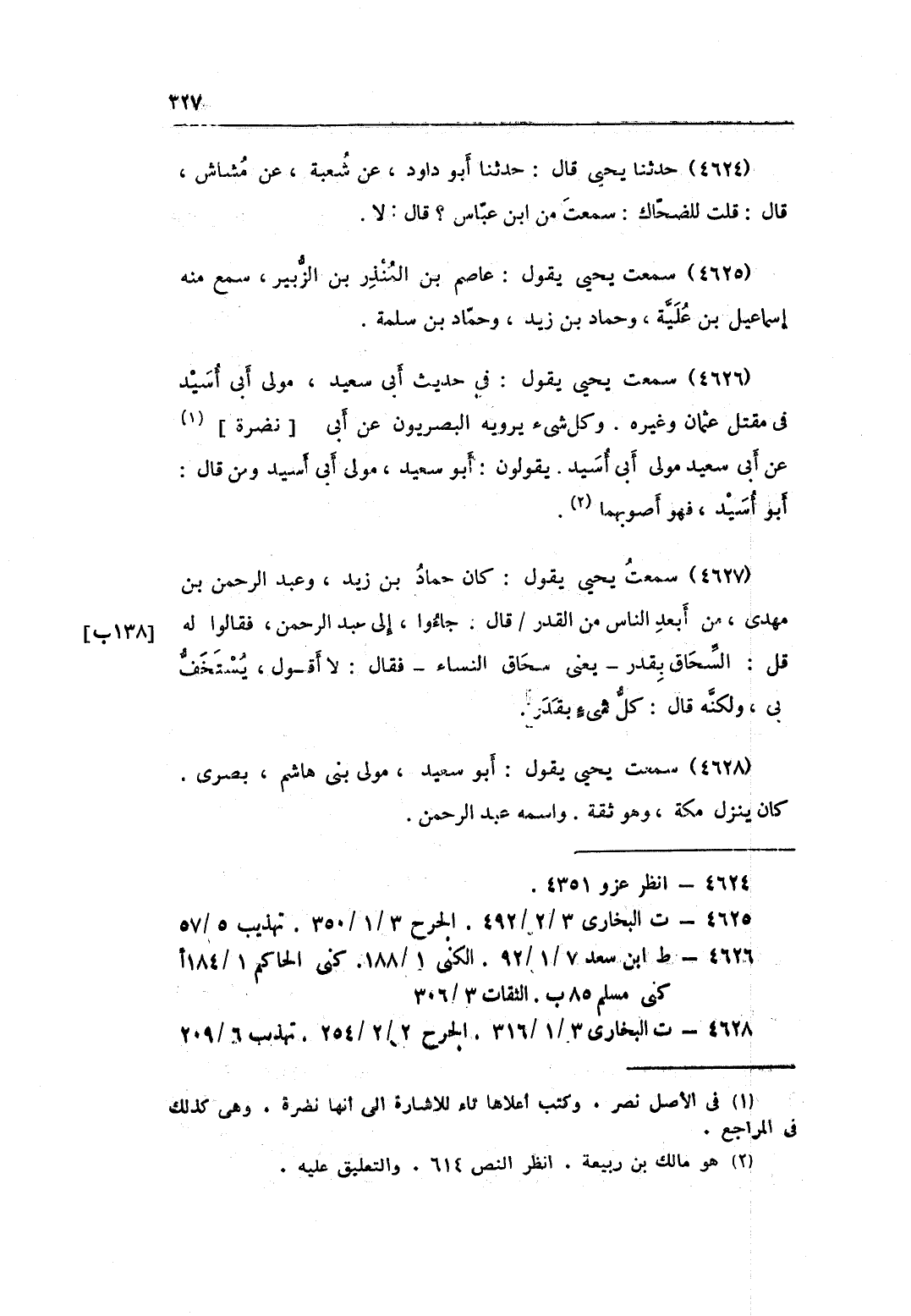 4626 - سَمِعت يحيى يَقُول فِي حَدِيث أبي سعيد مولى أبي أسيد فِي مقتل عُثْمَان وَغَيره وكل شَيْء يرويهِ البصريون عَن أبي نَضرة عَن أبي سعيد مولى أبي أسيد يَقُولُونَ أَبُو سعيد مولى أبي أسيد وَمن قَالَ أَبُو أسيد فَهُوَ أصوبهما