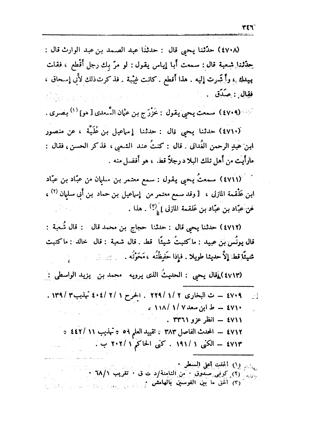 4711 - سَمِعت يحيى يَقُول سمع مُعْتَمر بن سُلَيْمَان من عباد بن عباد بن عَلْقَمَة الْمَازِني وَقد سمع مُعْتَمر من إِسْمَاعِيل بن حَمَّاد بن أبي سُلَيْمَان عَن عباد بن عباد بن عَلْقَمَة الْمَازِني هَذَا