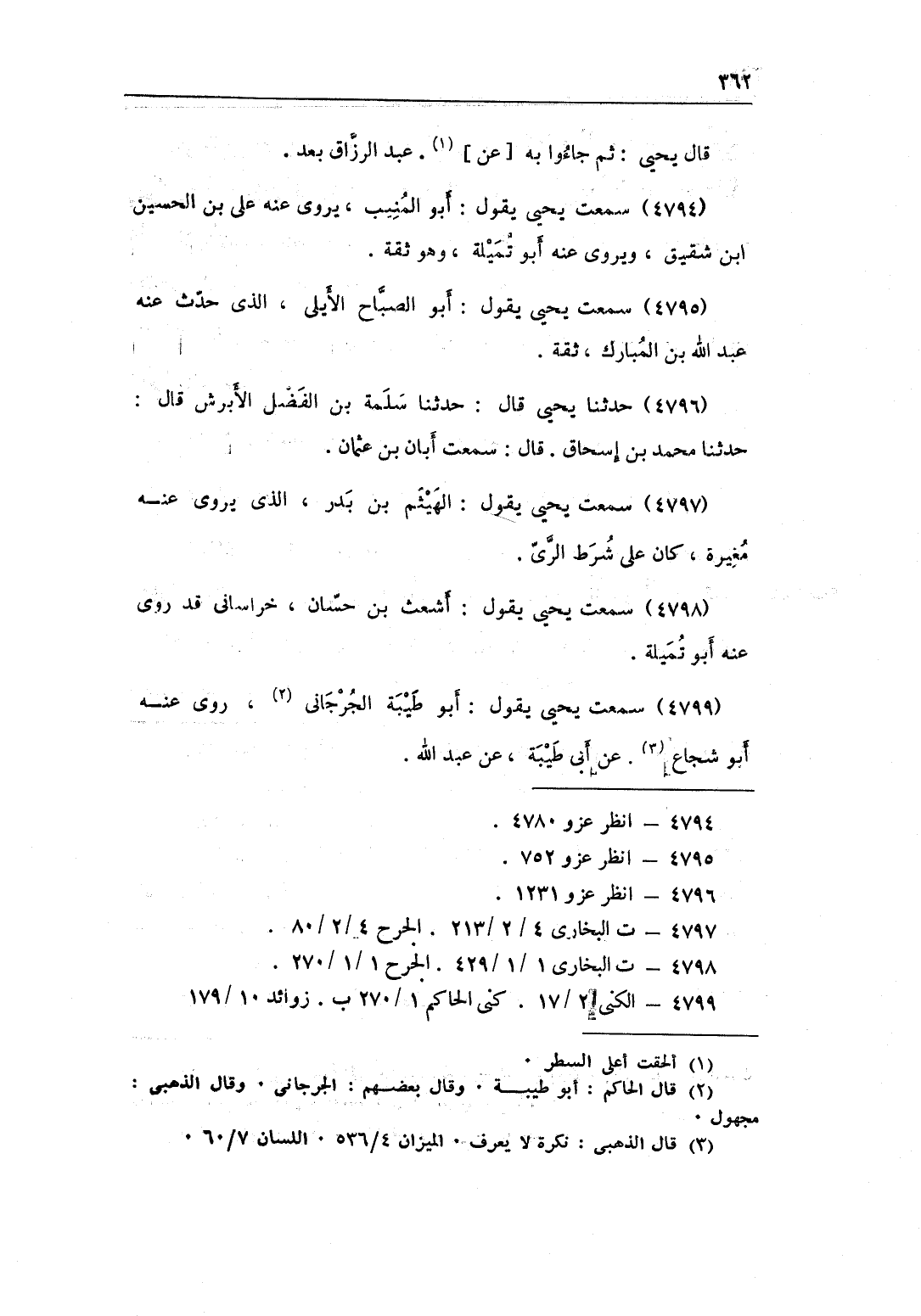4794 - سَمِعت يحيى يَقُول أَبُو الْمُنِيب يرْوى عَنهُ عَليّ بن الْحُسَيْن بن شَقِيق ويروى عَنهُ أَبُو تُمَيْلة وَهُوَ ثِقَة
