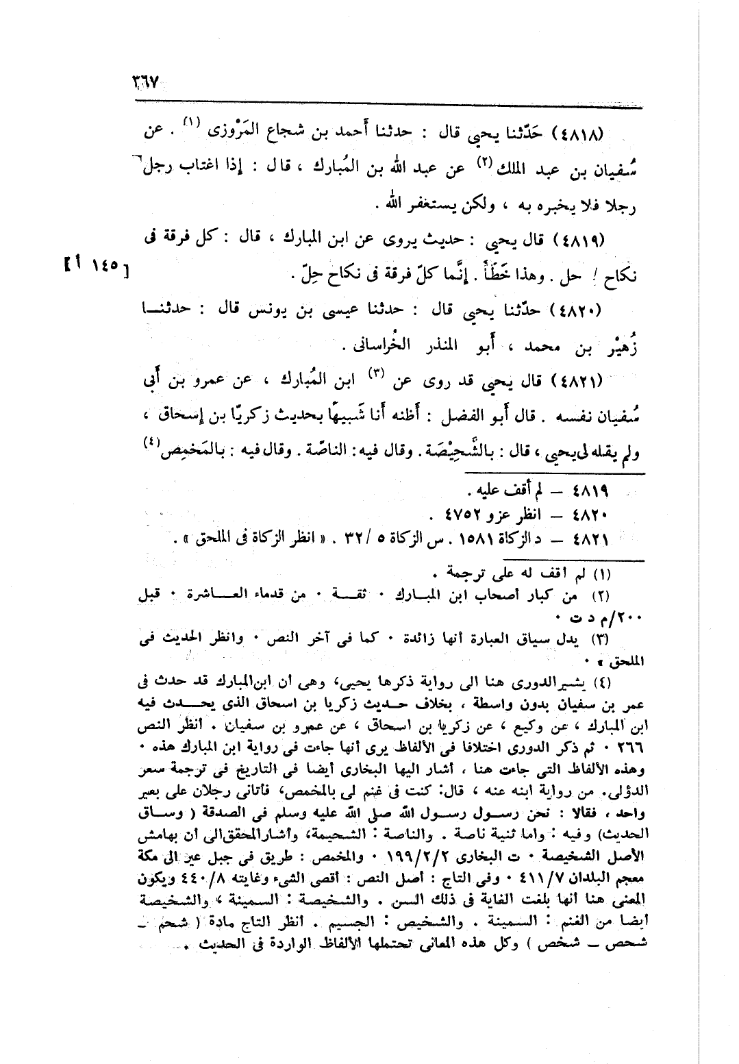 4821 - قَالَ يحيى قد روى عَن بن الْمُبَارك عَن عَمْرو بن أبي سُفْيَان نَفسه قَالَ أَبُو الْفضل أَظُنهُ أَنا شَبِيها بِحَدِيث زَكَرِيَّا بن إِسْحَاق وَلم يقلهُ لي يحيى قَالَ بالشخيصة وَقَالَ فِيهِ الناصة وَقَالَ فِيهِ بالمخمص هَذَا كُله فِي حَدِيث بن الْمُبَارك عَن عَمْرو بن أبي سُفْيَان وَهَذَا الْكَلَام أَظُنهُ أَنا فِي حَدِيث زَكَرِيَّا وَلم يقلهُ لي يحيى وَلكنه عِنْدِي كَذَا وَقد سَمِعت حَدِيث زَكَرِيَّا من روح وَهُوَ هَكَذَا وَقَالَ بعض أَصْحَابنَا غير يحيى هَذَا فِي كتاب بن الْمُبَارك كتاب الْفِتَن
