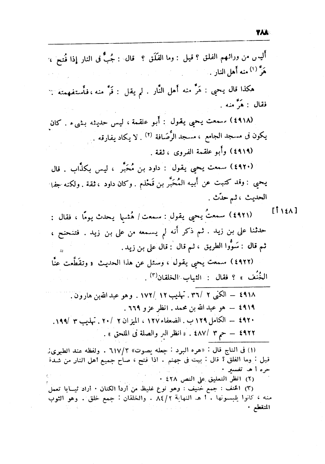 4922 - سَمِعت يحيى يَقُول وَسُئِلَ عَن هَذَا الحَدِيث وتقطعت عَنَّا الخنف فَقَالَ الثِّيَاب الخلقان