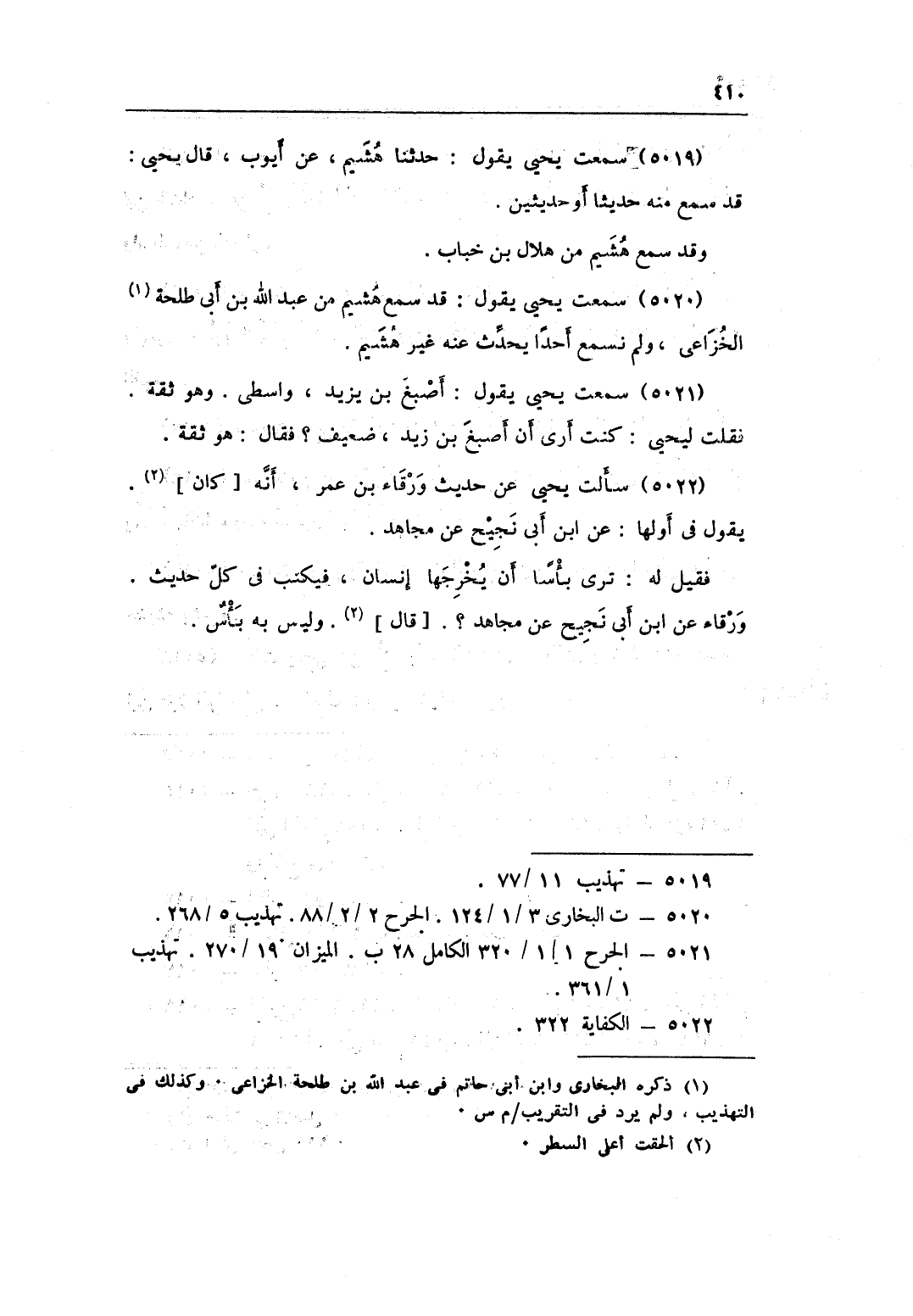 5020 - سَمِعت يحيى يَقُول قد سمع هشيم من عبد الله بن أبي طلة الْخُزَاعِيّ وَلم نسْمع أحدا يحدث عَنهُ غير هشيم