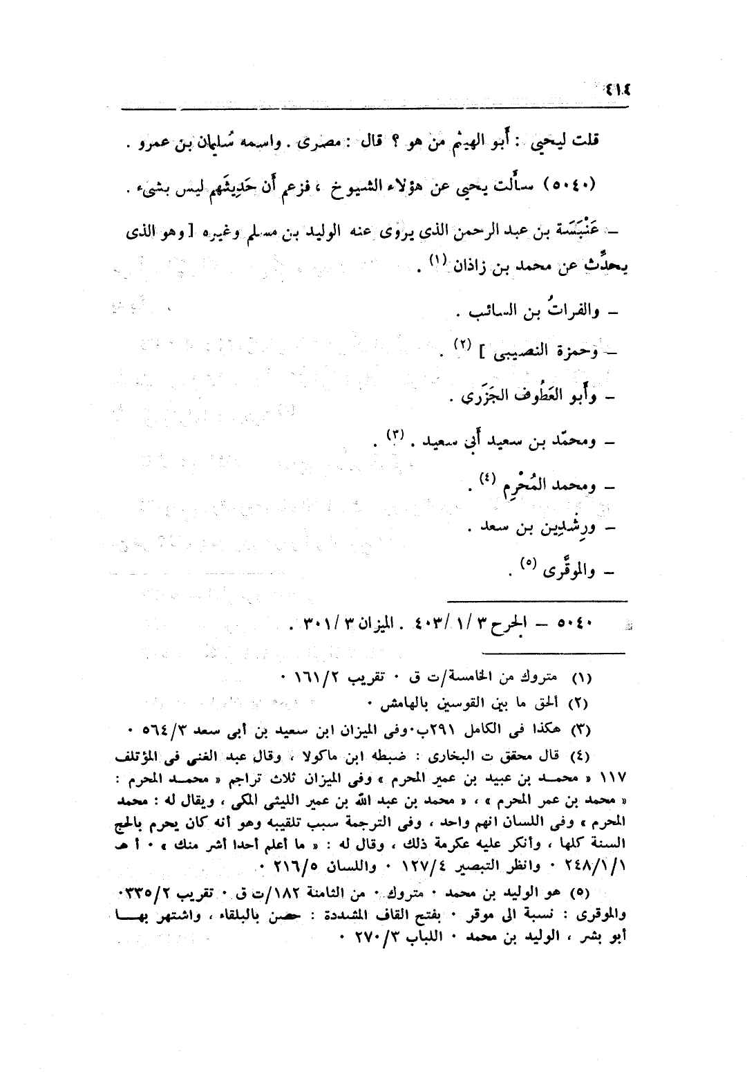 5040 - سَأَلت يحيى عَن هَؤُلَاءِ الشُّيُوخ فَزعم أَن حَدِيثهمْ لَيْسَ بِشَيْء عَنْبَسَة بن عبد الرَّحْمَن الَّذِي يرْوى عَنهُ الْوَلِيد بن مُسلم وَغَيره وَهُوَ الَّذِي يحدث عَن مُحَمَّد بن زَاذَان والفرات بن السَّائِب وَحَمْزَة النصيبي وَأَبُو العطوف الْجَزرِي وَمُحَمّد بن سعيد أبي سعيد وَمُحَمّد الْمحرم وَرشْدِين بن سعد والموقري ووزير الَّذِي يحدث بِحَدِيث مُعَاوِيَة أَن النَّبِي صلى الله عَلَيْهِ وَسلم أعطَاهُ سَهْما