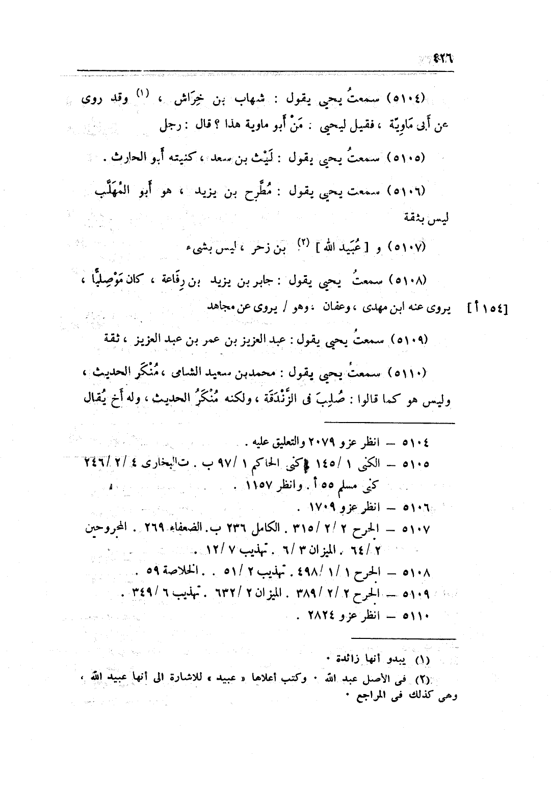 5110 - سَمِعت يحيى يَقُول مُحَمَّد بن سعيد الشَّامي مُنكر الحَدِيث وَلَيْسَ هُوَ كَمَا قَالُوا صلب فِي الزندقة وَلكنه مُنكر الحَدِيث وَله أَخ يُقَال لَهُ عبد الرَّحِيم بن سعيد الأبرص وَقد سمعنَا مِنْهُ بِبَغْدَاد وَكَانَ يرْوى عَن الزُّهْرِيّ قَالَ يحيى وَقد سمع مَرْوَان بن مُعَاوِيَة من مُحَمَّد بن سعيد هَذَا
