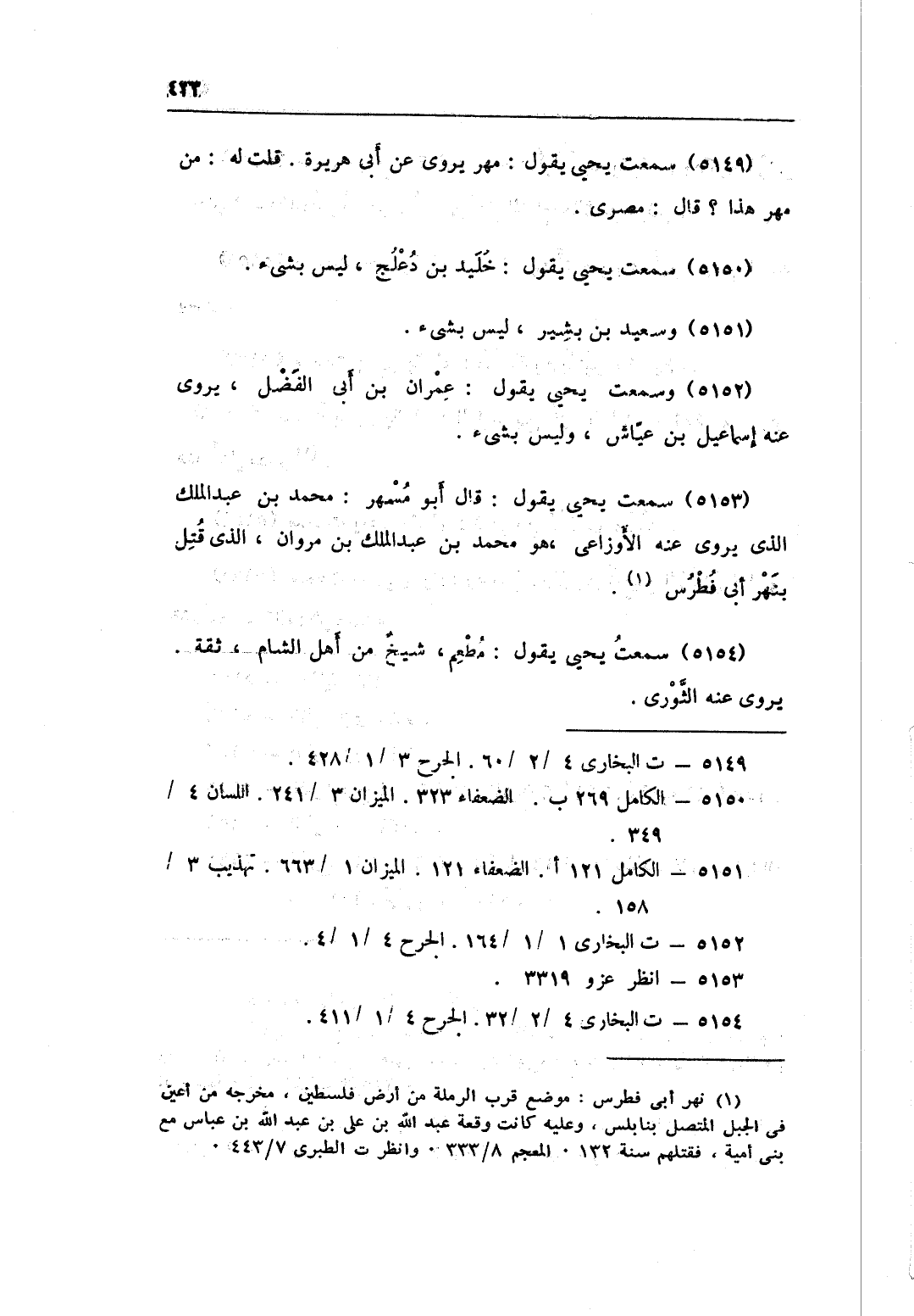 5153 - سَمِعت يحيى يَقُول قَالَ أَبُو مسْهر مُحَمَّد بن عبد الْملك الَّذِي يرْوى عَنهُ الْأَوْزَاعِيّ هُوَ مُحَمَّد بن عبد الْملك بن مَرْوَان الَّذِي قتل بنهر أبي فطرس