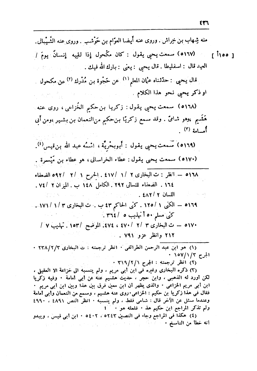 5168 - سَمِعت يحيى يَقُول زَكَرِيَّا بن حَكِيم الْخُزَاعِيّ روى عَنهُ هشيم وَهُوَ شَامي وَقد سمع زَكَرِيَّا بن حَكِيم من النُّعْمَان بن بشير وَمن أبي أُمَامَة