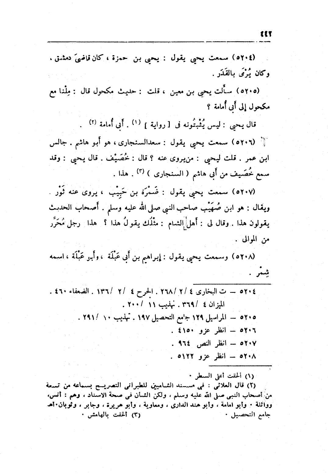 5205 - سَأَلت يحيى بن معِين قلت حَدِيث مَكْحُول قَالَ ملنا مَعَ مَكْحُول الى أبي أُمَامَة قَالَ يحيى لَيْسَ يثبتونه فِي رِوَايَة أبي أُمَامَة