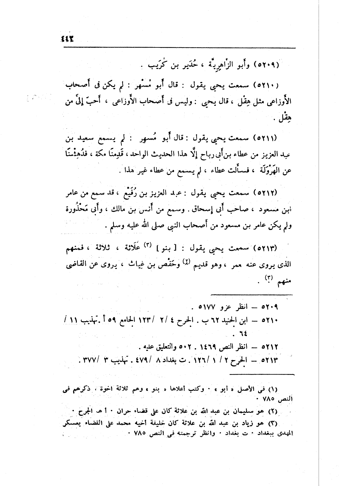 5213 - سَمِعت يحيى يَقُول بَنو علاثة ثَلَاثَة فَمنهمْ الَّذِي يرْوى عَنهُ معمر وَهُوَ قديم وَحَفْص بن غياث يرْوى عَن القَاضِي مِنْهُم وحرمي بن حَفْص يرْوى عَن القَاضِي مِنْهُم وَكَانَ قَاضِي بَغْدَاد وهم جَمِيعًا من أهل الجزيرة