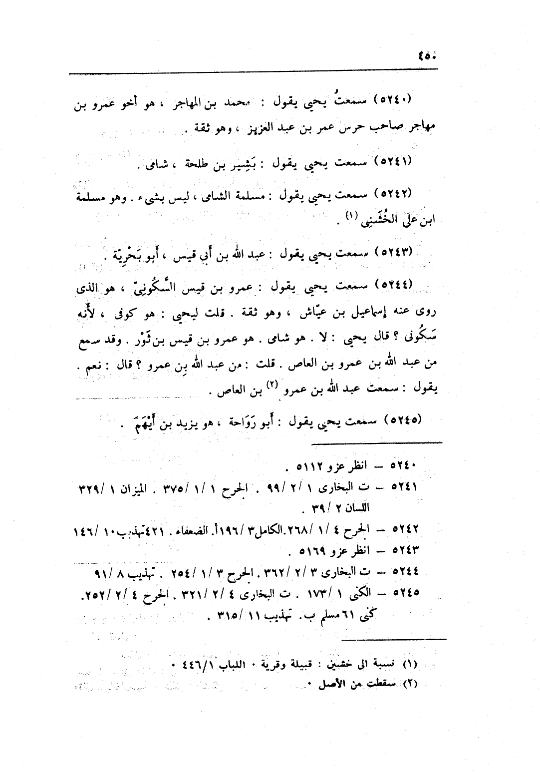 5244 - سَمِعت يحيى يَقُول عَمْرو بن قيس السكونِي هُوَ الَّذِي روى عَنهُ إِسْمَاعِيل بن عَيَّاش وَهُوَ ثِقَة قلت ليحيى هُوَ كُوفِي لِأَنَّهُ سكوني قَالَ يحيى لَا هُوَ شَامي هُوَ عَمْرو بن قيس بن ثَوْر وَقد سمع من عبد الله بن عَمْرو بن الْعَاصِ قلت من عبد الله بن عَمْرو قَالَ نعم يَقُول سَمِعت عبد الله بن عَمْرو بن الْعَاصِ