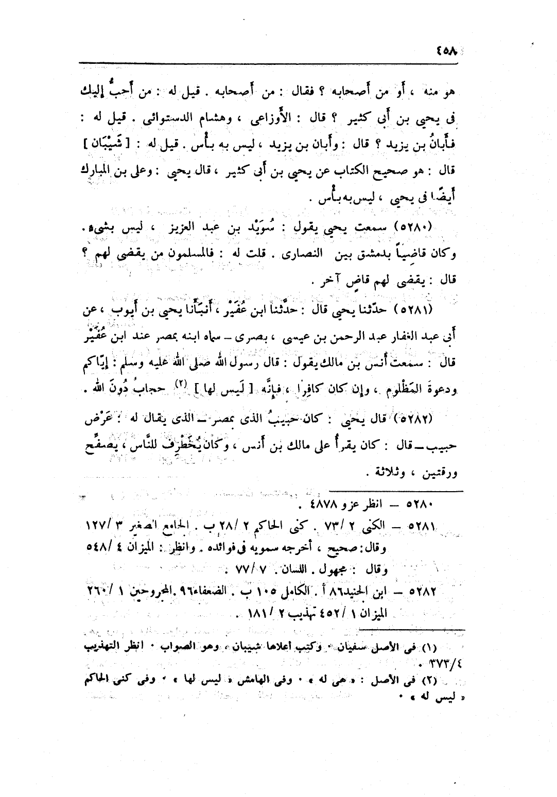 5280 - سَمِعت يحيى يَقُول سُوَيْد بن عبد الْعَزِيز لَيْسَ بِشَيْء وَكَانَ قَاضِيا بِدِمَشْق بَين النصاري قلت لَهُ فالمسلمون من يقْضى لَهُم قَالَ يقْضى لَهُم قَاض آخر