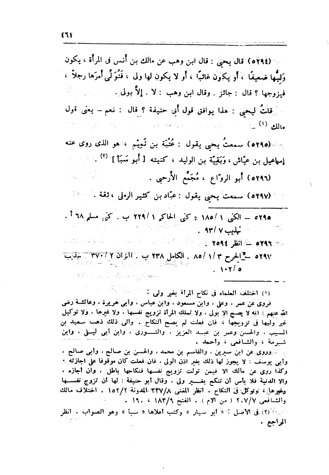 5294 - قَالَ يحيى قَالَ بن وهب عَن مَالك بن أنس فِي الْمَرْأَة يكون وَليهَا ضَعِيفا أَو يكون غَائِبا أَو لَا يكون لَهَا ولي فتولي أمرهَا رجلا فيزوجها قَالَ جَائِز وَقَالَ بن وهب لَا إِلَّا بولِي قلت ليحيى هَذَا يُوَافق قَول أبي حنيفَة قَالَ نعم يعْنى قَول مَالك