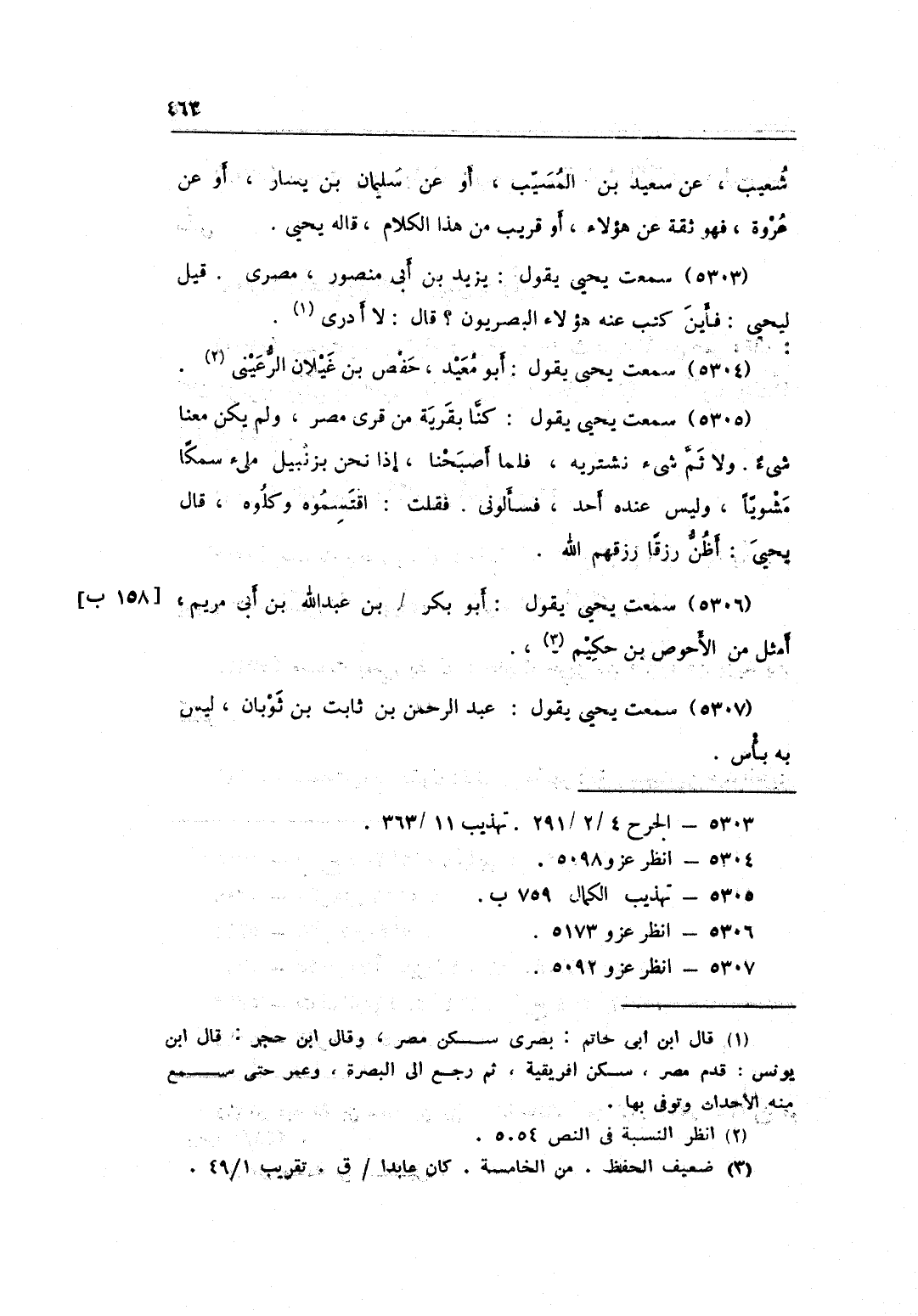 5303 - سَمِعت يحيى يَقُول يزِيد بن أبي مَنْصُور مصري قيل ليحيى فَأَيْنَ كتب عَنهُ هَؤُلَاءِ البصريون قَالَ لَا أَدْرِي