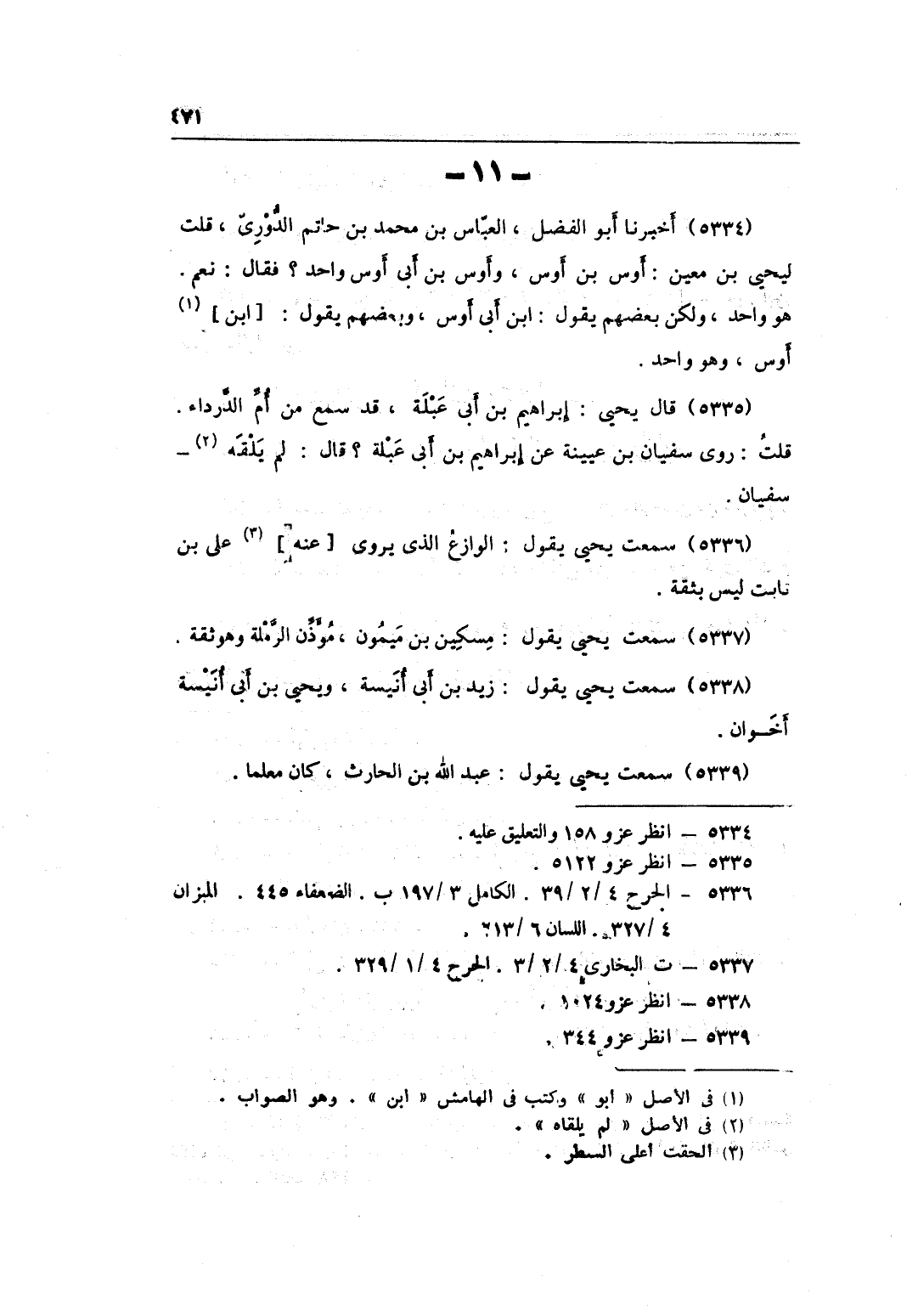 5334 - أخبرنَا أَبُو الْفضل الْعَبَّاس بن مُحَمَّد بن حَاتِم الدوري قلت ليحيى بن معِين أَوْس بن أَوْس وَأَوْس بن أبي أَوْس وَاحِد فَقَالَ نعم هُوَ وَاحِد وَلَكِن بَعضهم يَقُول بن أبي أَوْس وَبَعْضهمْ يَقُول بن أَوْس وَهُوَ وَاحِد
