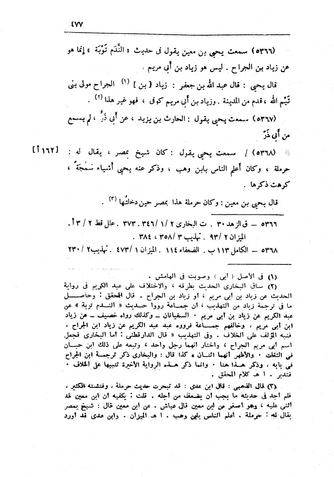 5366 - سَمِعت يحيى بن معِين يَقُول فِي حَدِيث النَّدَم تَوْبَة إِنَّمَا هُوَ عَن زِيَاد بن الْجراح لَيْسَ هُوَ زِيَاد بن أبي مَرْيَم قَالَ يحيى قَالَ عبد الله بن جَعْفَر زِيَاد بن الْجراح مولى بنى تيم الله قدم من الْمَدِينَة وَزِيَاد بن أبي مَرْيَم كُوفِي فَهُوَ غير هَذَا