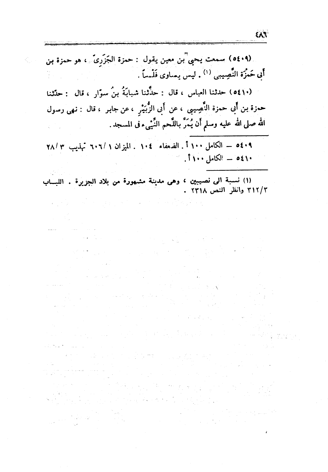 5409 - سَمِعت يحيى بن معِين يَقُول حَمْزَة الْجَزرِي هُوَ حَمْزَة بن أبي حَمْزَة النصيبي لَيْسَ يُسَاوِي فلسًا