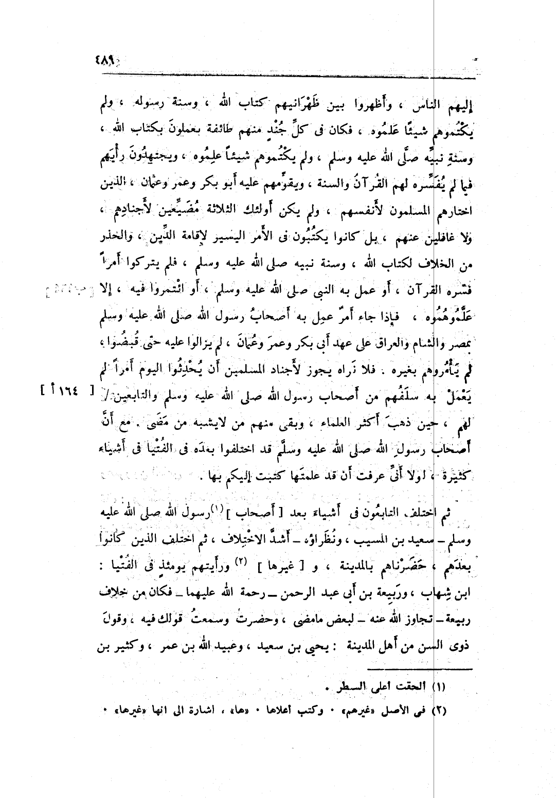 إِلَيْهِم النَّاس وأظهروا بَين ظهرانيهم كتاب الله وَسنة رَسُوله وَلم يكتموهم شَيْئا علموه فَكَانَ فِي كل جند مِنْهُم طَائِفَة يعْملُونَ بِكِتَاب الله وَسنة نبيه صلى الله عَلَيْهِ وَسلم وَلم يكتموهم شَيْئا علموه ويجتهدون رَأْيهمْ فِيمَا لم يفسره لَهُم الْقُرْآن وَالسّنة ويقومهم عَلَيْهِ أَبُو بكر وَعمر وَعُثْمَان الَّذين اخْتَارَهُمْ الْمُسلمُونَ لأَنْفُسِهِمْ وَلم يكن أُولَئِكَ الثَّلَاثَة مضيعين لأجنادهم وَلَا غافلين عَنْهُم بل كَانُوا يَكْتُبُونَ فِي الْأَمر الْيَسِير لإِقَامَة الدَّين والحذر من الْخلاف لكتاب الله وَسنة نبيه صلى الله عَلَيْهِ وَسلم فَلم يتْركُوا أمرا فسره الْقُرْآن أَو عمل بِهِ النَّبِي صلى الله عَلَيْهِ وَسلم أَو ائْتَمرُوا فِيهِ الا علموهموه فَإِذا جَاءَ أَمر عمل بِهِ أَصْحَاب رَسُول الله صلى الله عَلَيْهِ وَسلم بِمصْر وَالشَّام وَالْعراق على عهد أبي بكر وَعمر وَعُثْمَان لم يزَالُوا عَلَيْهِ حَتَّى قبضوا لم يأمروهم بِغَيْرِهِ فَلَا نرَاهُ يجوز لأجناد الْمُسلمين أَن يحدثوا الْيَوْم أمرا لم يعْمل بِهِ سلفهم من أَصْحَاب رَسُول الله صلى الله عَلَيْهِ وَسلم وَالتَّابِعِينَ لَهُم حِين ذهب أَكثر الْعلمَاء وبقى مِنْهُم من لَا يشبه من مضى مَعَ أَن أَصْحَاب رَسُول الله صلى الله عَلَيْهِ وَسلم قد اخْتلفُوا بعده فِي الْفتيا فِي أَشْيَاء كَثِيرَة لَوْلَا أَنِّي عرفت أَن قد علمتها كتبت إِلَيْكُم بهَا ثمَّ اخْتلف التابعون فِي أَشْيَاء بعد أَصْحَاب رَسُول الله صلى الله عَلَيْهِ وَسلم سعيد بن الْمسيب ونظراؤه أَشد الِاخْتِلَاف ثمَّ اخْتلف الَّذين كَانُوا بعدهمْ حضرناهم بِالْمَدِينَةِ وَغَيرهَا ورأيتهم يَوْمئِذٍ فِي الْفتيا بن شهَاب وَرَبِيعَة بن أبي عبد الرَّحْمَن رَحْمَة الله عَلَيْهِمَا فَكَانَ من خلاف ربيعَة تجَاوز الله عَنهُ لبَعض مَا مضى وَحَضَرت وَسمعت قَوْلك فِيهِ وَقَول ذَوي السن من أهل الْمَدِينَة يحيى بن سعيد وَعبيد الله بن عمر وَكثير بن