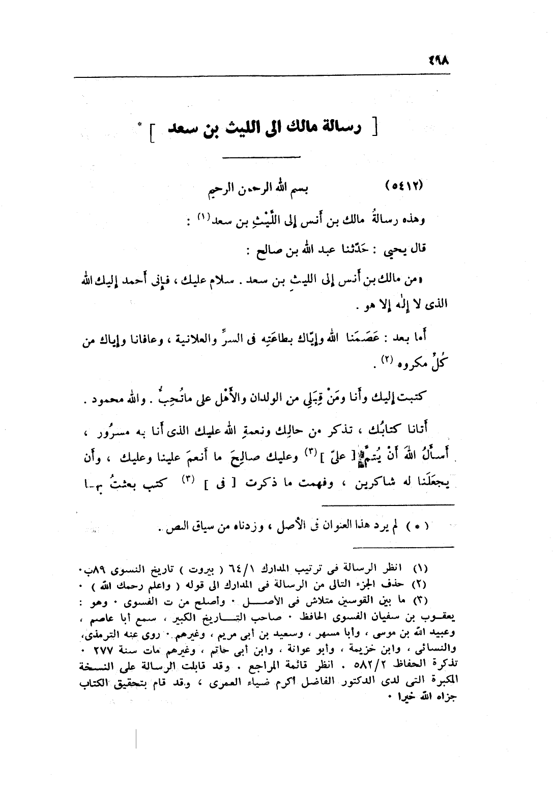 5412 - بِسم الله الرَّحْمَن الرَّحِيم وَهَذِه رِسَالَة مَالك بن أنس إِلَى اللَّيْث بن سعد قَالَ يحيى حَدثنَا عبد الله بن صَالح من مَالك بن أنس إِلَى اللَّيْث بن سعد سَلام عَلَيْك فَإِنِّي أَحْمد إِلَيْك الله الَّذِي لَا إِلَه إِلَّا هُوَ أما بعد عصمنا الله وَإِيَّاك بِطَاعَتِهِ فِي السِّرّ وَالْعَلَانِيَة وعافانا وَإِيَّاك من كل مَكْرُوه كتبت إِلَيْك وَأَنا وَمن قبلي من الْولدَان والأهل على مَا تحب وَالله مَحْمُود أَتَانَا كتابك تذكر من حالك ونعمة الله عَلَيْك الَّذِي أَنا بِهِ مسرور أسأَل الله أَن يتم عَليّ وَعَلَيْك صَالح مَا أنعم علينا وَعَلَيْك وَأَن يجعلنا لَهُ شاكرين وفهمت مَا ذكرت فِي كتب بعثت بهَا