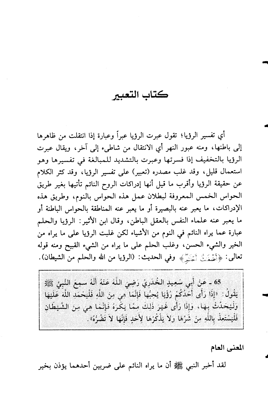 65 - عن أبي سعيد الخدري رضي الله عنه أنه سمع النبي صلى الله عليه وسلم يقول "إذا رأى أحدكم رؤيا يحبها فإنما هي من الله فليحمد الله عليها وليحدث بها وإذا رأى غير ذلك مما يكره فإنما هي من الشيطان فليستعذ من شرها ولا يذكرها لأحد فإنها لا تضره"