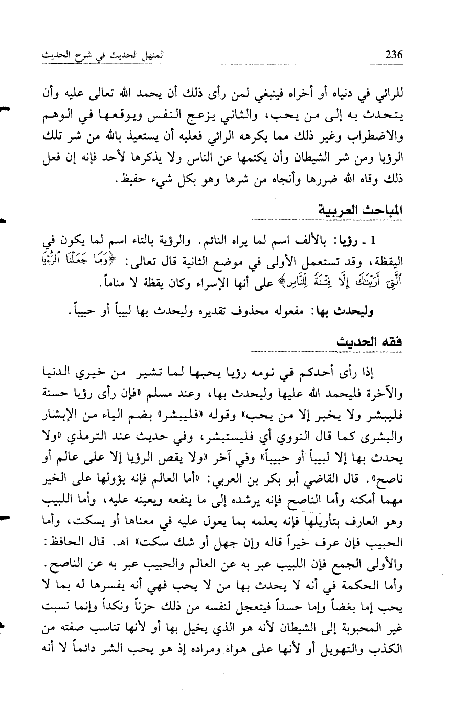إذا رأى أحدكم في نومه رؤيا يحبها لما تشير من خيري الدنيا والآخرة فليحمد الله عليها وليحدث بها وعند مسلم "فإن رأى رؤيا حسنة فليبشر ولا يخبر إلا من يحب" وقوله "فليبشر" بضم الياء من الإبشار والبشرى كما قال النووي أي فليستبشر وفي حديث عند الترمذي "ولا يحدث بها إلا لبيبا أو حبيبا" وفي آخر "ولا يقص الرؤيا إلا على عالم أو ناصح" قال القاضي أبو بكر ابن العربي "أما العالم فإنه يؤولها على الخير مهما أمكنه وأما الناصح فإنه يرشده إلى ما ينفعه ويعينه عليه وأما اللبيب وهو العارف بتأويلها فإنه يعلمه بما يعول عليه في معناها أو يسكت وأما الحبيب فإن عرف خيرا قاله وإن جهل أو شك سكت" اهـ قال الحافظ والأولى الجمع فإن اللبيب عبر به عن العالم والحبيب عبر به عن الناصح وأما الحكمة في أنه لا يحدث بها من لا يحب فهي أنه يفسرها له بما لا يحب إما بغضا وإما حسدا فيتعجل لنفسه من ذلك حزنا ونكدا وإنما نسبت غير المحبوبة إلى الشيطان لأنه هو الذي يخيل بها أو لأنها تناسب صفته من الكذب والتهويل أو لأنها على هواه ومراده إذ هو يحب الشر دائما لا أنه