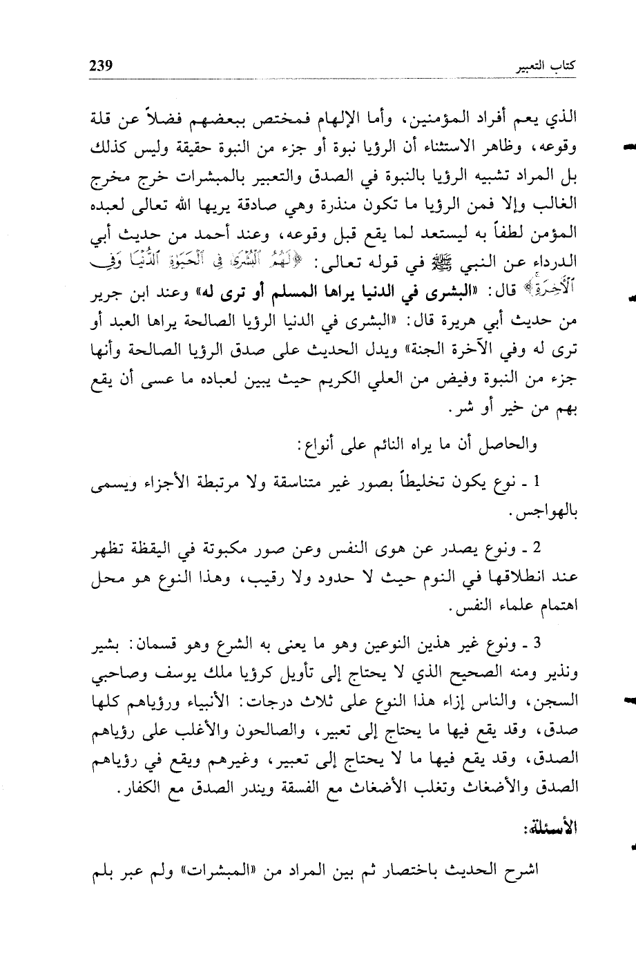 3 - ونوع غير هذين النوعين وهو ما يعني به الشرع وهو قسمان بشير ونذير ومنه الصحيح الذي لا يحتاج إلى تأويل كرؤيا ملك يوسف وصاحبي السجن والناس إزاء هذا النوع على ثلاث درجات الأنبياء ورؤياهم كلها صدق وقد يقع فيها ما يحتاج إلى تعبير والصالحون والأغلب على رؤياهم الصدق وقد يقع فيها ما لا يحتاج إلى تعبير وغيرهم ويقع في رؤياهم الصدق والأضغاث وتغلب الأضغاث مع الفسقة ويندر الصدق مع الكفار.