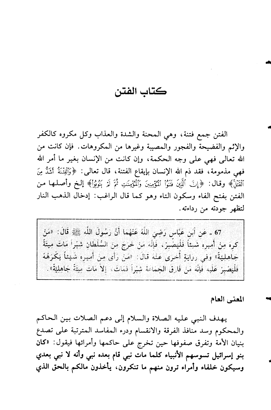 67 - عن ابن عباس رضي الله عنهما أن رسول الله صلى الله عليه وسلم قال "من كره من أميره شيئا فليصبر فإنه من خرج من السلطان شبرا مات ميتة جاهلية" وفي رواية أخرى عنه قال "من رأى من أميره شيئا يكرهه فليصبر عليه فإنه من فارق الجماعة شبرا فمات إلا مات ميتة جاهلية"
