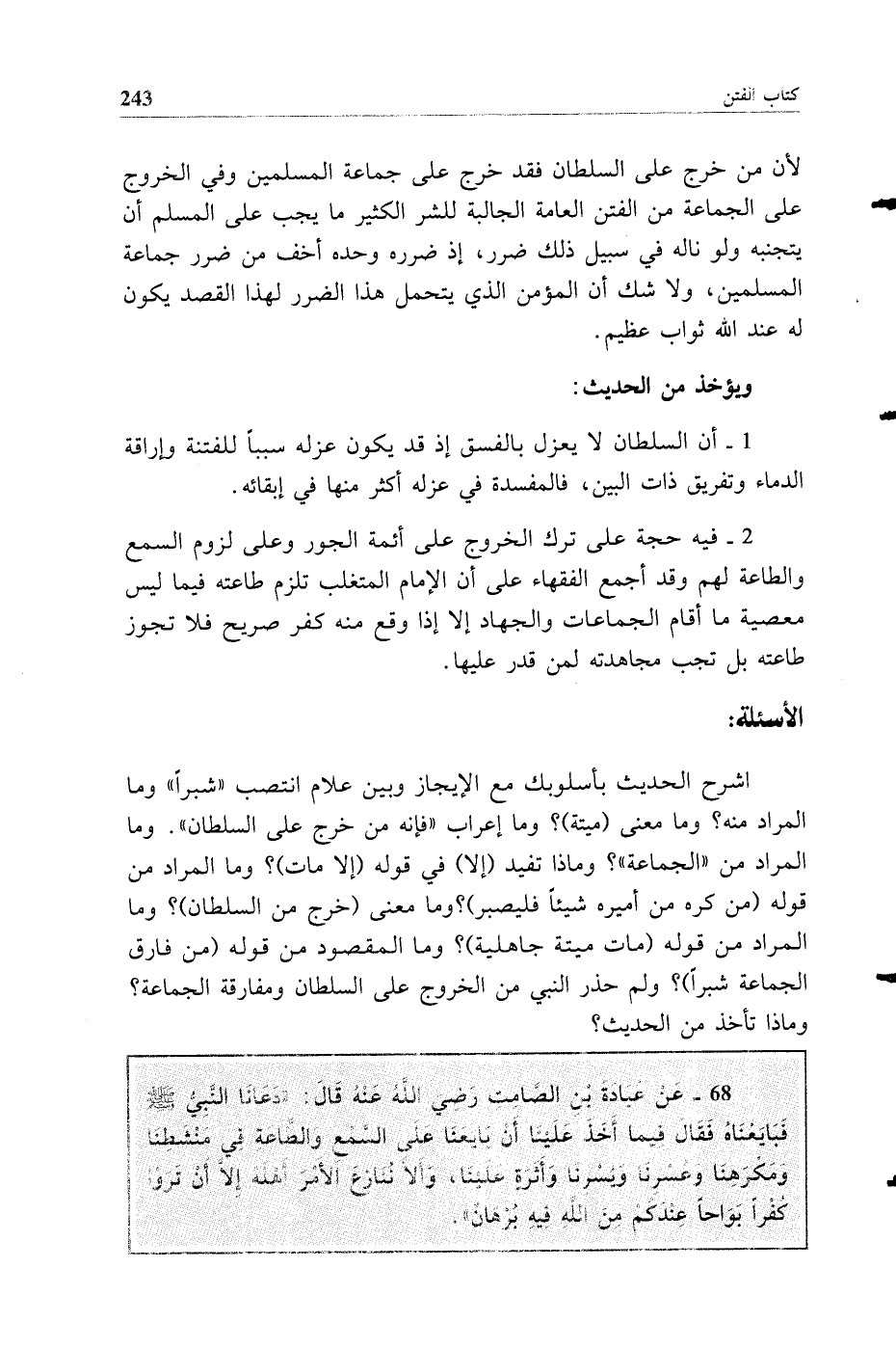 68 - عن عبادة بن الصامت رضي الله عنه قال "دعانا النبي صلى الله عليه وسلم فبايعناه فقال فيما أخذ علينا أن بايعنا على السمع والطاعة في منشطنا ومكرهنا وعسرنا ويسرنا وأثره علينا وأن لا ننازع الأمر أهله إلا أن تروا كفرا بواحا عندكم من الله فيه برهان"