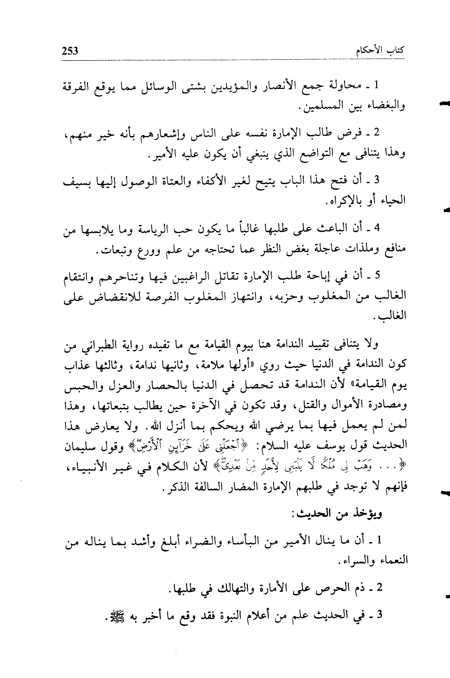 ولا يتنافى تقييد الندامة هنا بيوم القيامة مع ما تفيده رواية الطبراني من كون الندامة في الدنيا حيث روى "أولها ملامة وثانيها ندامة وثالثها عذاب يوم القيامة" لأن الندامة قد تحصل في الدنيا بالحصار والعزل والحبس ومصادرة الأموال والقتل وقد تكون في الآخرة حين يطالب بتبعاتها وهذا لمن لم يعمل فيها بما يرضي الله ويحكم بما أنزل الله ولا يعارض هذا الحديث قول يوسف عليه السلام "اجعلني على خزائن الأرض" وقول سليمان "هب لي ملكا لا ينبغي لأحد من بعدي" لأن الكلام في غير الأنبياء فإنهم لا توجد في طلبهم الإمارة المضار السالفة الذكر