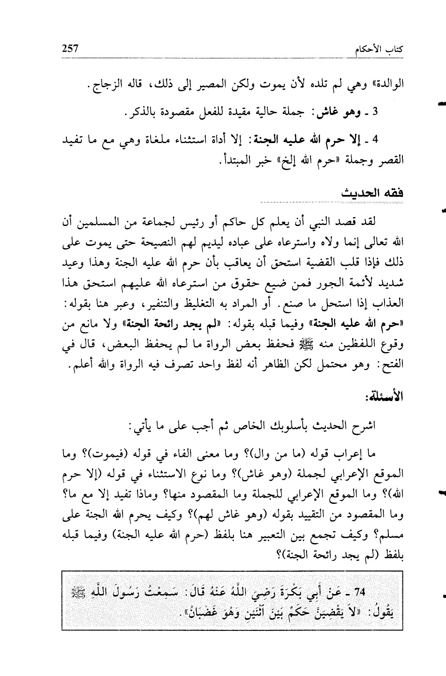 لقد قصد النبي صلى الله عليه وسلم أن يعلم كل حاكم أو رئيس لجماعة من المسلمين أن الله تعالى إنما ولاه واسترعاه على عباده ليديم لهم النصيحة حتى يموت على ذلك فإذا قلب القضية استحق أن يعاقب بأن حرم الله عليه الجنة وهذا وعيد شديد لائمة الجور فمن ضيع حقوق من استرعاه الله عليهم استحق هذا العذاب إذا استحل ما صنع أو المراد به التغليظ والتنفير وعبر هنا بقوله "حرم الله عليه الجنة" وفيما قبله بقوله "لم يجد رائحة الجنة" ولا مانع من وقوع اللفظين منه صلى الله عليه وسلم فحفظ بعض الرواة ما لم يحفظ البعض قال في الفتح وهو محتمل لكن الظاهر أنه لفظ واحد تصرف فيه الرواة والله أعلم.