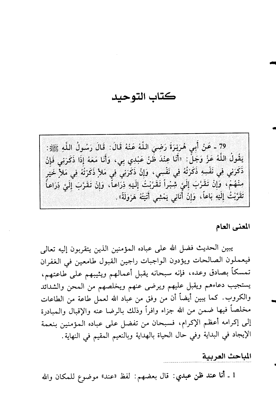 79 - عن أبي هريرة رضي الله عنه قال قال رسول الله صلى الله عليه وسلم يقول الله عز وجل "أنا عند ظن عبدي بي وأنا معه إذا ذكرني فإن ذكرني في نفسه ذكرته في نفسي وإن ذكرني في ملإ ذكرته في ملإ خير منهم وإن تقرب إلي بشبر تقربت إليه ذراعا وإن تقرب إلي ذراعا تقربت إليه باعا وإن أتاني يمشي أتيته هرولة"