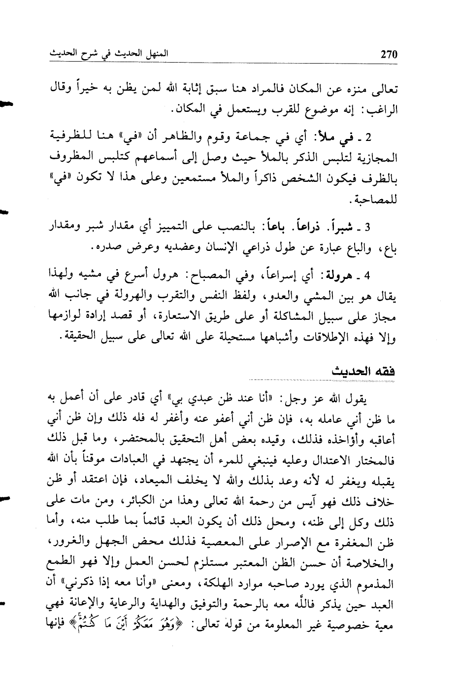 يقول الله عز وجل "أنا عند ظن عبدي بي" أي قادر على أن أعمل به ما ظن أني عامله به فإن ظن أني أعفو عنه وأغفر له فله ذلك وإن ظن أني أعاقبه وأؤاخذه فذلك وقيده بعض أهل التحقيق بالمحتضر وما قبل ذلك فالمختار الاعتدال وعليه فينبغي للمرء أن يجتهد في العبادات موقنا بأن الله يقبله ويغفر له لأنه وعد بذلك والله لا يخلف الميعاد فإن اعتقد أو ظن خلاف ذلك فهو آيس من رحمة الله تعالى وهذا من الكبائر ومن مات على ذلك وكل إلى ظنه ومحل ذلك أن يكون العبد قائما بما طلب منه وأما ظن المغفرة مع الإصرار على المعصية فذلك محض الجهل والغرور والخلاصة أن حسن الظن المعتبر مستلزم لحسن العمل وإلا فهو الطمع المذموم الذي يورد صاحبه موارد الهلكة ومعنى "وأنا معه إذا ذكرني" أن العبد حين يذكر فالله معه بالرحمة والتوفيق والهداية والرعاية والإعانة فهي معية خصوصية غير المعلومة من قوله تعالى {وهو معكم أين ما كنتم} فإنها