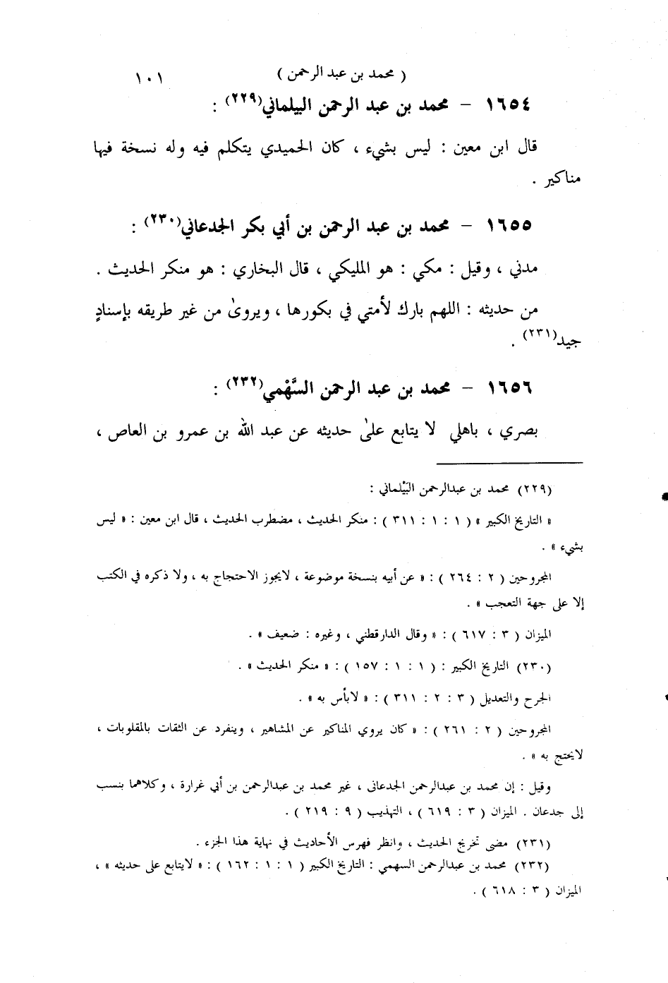 §1654 - مُحَمَّدُ بْنُ عَبْدِ الرَّحْمَنِ بْنِ الْبَيْلَمَانِيِّ حَدَّثَنَا أَحْمَدُ بْنُ مَحْمُودٍ، حَدَّثَنَا عُثْمَانُ بْنُ سَعِيدٍ، قَالَ: قُلْتُ لِيَحْيَى بْنِ مَعِينٍ: مُحَمَّدُ بْنُ عَبْدِ الرَّحْمَنِ بْنِ الْبَيْلَمَانِيِّ؟ فَقَالَ: لَيْسَ بِشَيْءٍ. حَدَّثَنِي آدَمُ، قَالَ: سَمِعْتُ الْبُخَارِيَّ، قَالَ: مُحَمَّدُ بْنُ عَبْدِ الرَّحْمَنِ بْنِ الْبَيْلَمَانِيِّ: كَانَ الْحُمَيْدِيُّ يَتَكَلَّمُ فِيهِ