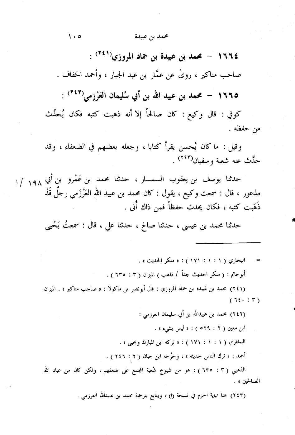 §1664 - مُحَمَّدُ بْنُ عُبَيْدِ اللَّهِ الْعَرْزَمِيُّ حَدَّثَنَا أَحْمَدُ بْنُ عَلِيٍّ الْأَبَّارُ، حَدَّثَنَا أَبُو هِشَامٍ الرِّفَاعِيُّ، حَدَّثَنَا يَحْيَى بْنُ آدَمَ، قَالَ: شَهِدْتُ سُفْيَانَ وَهُوَ يَقُولُ: أَيُّ شَيْءٍ تَحْفَظُونَ فِي الرَّجُلِ يُوصِي لِلرَّجُلِ بِسَهْمٍ مِنْ مَالِهِ؟ فَقَالَ لَهُ رَجُلٌ مِنْ أَصْحَابِ الْحَدِيثِ: أَبُو قَيْسٍ عَنْ هُذَيْلٍ , عَنْ عَبْدِ اللَّهِ , قَالَ: مَنْ دُونَهُ , قَالَ: الْعَرْزَمِيُّ قَالَ: زِدْنِي. حَدَّثَنَا أَحْمَدُ بْنُ عَلِيٍّ , قَالَ سَمِعُتُ أَبَا غَسَّانَ يَقُولُ: قَالَ جَرِيرٌ: كُنْتُ أَخْتَلِفُ إِلَى لَيْثِ بْنِ أَبِي سُلَيْمٍ وَكَانَ أَبُو الْأَحْوَصِ يَخْتَلِفُ إِلَى مُحَمَّدِ بْنِ عُبَيْدِ اللَّهِ الْعَرْزَمِيِّ , فَكُنْتُ رُبَّمَا قُلْتُ لَهُ: تَعَالَ إِلَى صَاحِبِي , فَيَقُولُ: لَا، بَلْ تَعَالَ أَنْتَ إِلَى صَاحِبِي , قَالَ: فَرَجُحَ صَاحِبِي وَذَهَبَ صَاحِبُهُ. حَدَّثَنَا يُوسُفُ بْنُ يَعْقُوبَ السِّمْسَارُ، حَدَّثَنَا مُحَمَّدُ بْنُ عَمْرِو بْنِ أَبِي مَذْعُورٍ قَالَ: سَمِعْتُ وَكِيعًا، يَقُولُ: كَانَ مُحَمَّدُ بْنُ عُبَيْدِ اللَّهِ الْعَرْزَمِيُّ رَجُلًا صَالِحًا قَدْ ذَهَبَتْ كُتُبُهُ , فَكَانَ يُحَدِّثُ حِفْظًا , فَمِنْ ذَاكَ , أُتِيَ. حَدَّثَنَا مُحَمَّدُ بْنُ عِيسَى، حَدَّثَنَا صَالِحٌ، حَدَّثَنَا عَلِيٌّ قَالَ: سَمِعْتُ يَحْيَى، يَقُولُ: سَأَلْتُ الْعَرْزَمِيَّ الْأَصْغرَ فَجَعَلَ لَا يَحْفَظُ , فَأَتَيْتُ بِكِتَابٍ فَجَعَلَ لَا يُحْسِنُ يَقْرَأُ. حَدَّثَنَا زَكَرِيَّا بْنُ يَحْيَى، حَدَّثَنَا مُحَمَّدُ بْنُ الْمُثَنَّى قَالَ: مَا سَمِعْتُ عَبْدَ الرَّحْمَنِ، يُحَدِّثُ عَنْ مُحَمَّدِ بْنِ عُبَيْدِ اللَّهِ الْعَرْزَمِيِّ. حَدَّثَنَا مُحَمَّدُ بْنُ عِيسَى، حَدَّثَنَا عَمْرُو بْنُ عَلِيٍّ قَالَ: كَانَ يَحْيَى وَعَبْدُ الرَّحْمَنِ لَا يُحَدِّثَانِ , عَنْ مُحَمَّدِ بْنِ عُبَيْدِ اللَّهِ الْعَرْزَمِيِّ , وَكَانَ سُفْيَانُ يُحَدِّثُ عَنْهُ , وَكَانَ شُعْبَةُ يُحَدِّثُ عَنْهُ. حَدَّثَنَا مُحَمَّدُ بْنُ عُثْمَانَ قَالَ: سَمِعْتُ يَحْيَى بْنَ مَعِينٍ، وَأَصْحَابُنَا عِنْدَهُ , أَبِي وَعَمِّي الْقَاسِمُ وَابْنُ نُمَيْرٍ وَعَبْدُ اللَّهِ بْنُ أَبِي زِيَادٍ وَهَارُونُ بْنُ إِسْحَاقَ , وَذَكَرُوا مُحَمَّدَ بْنَ عُبَيْدِ اللَّهِ الْعَرْزَمِيَّ وَبُكَيْرَ بْنَ عَامِرٍ وَمُوسَى بْنَ مَطِيْرٍ وَمُوسَى بْنَ طَرِيفٍ , فَسَمِعْتُ أَبِي يَقُولُ: كُلُّ هَؤُلَاءِ ضُعَفَاءُ، فَمَا رَدَّ عَلَيْهِ أَحَدٌ مِنْهُمْ. حَدَّثَنَا مُحَمَّدُ بْنُ عِيسَى، حَدَّثَنَا الْعَبَّاسُ بْنُ مُحَمَّدٍ قَالَ: سَمِعْتُ يَحْيَى، يَقُولُ: مُحَمَّدُ بْنُ عُبَيْدِ اللَّهِ الْعَرْزَمِيُّ لَيْسَ بِشَيْءٍ، وَفِي مَوْضِعٍ آخَرَ مُحَمَّدُ بْنُ عُبَيْدِ اللَّهِ الْعَرْزَمِيُّ لَا يَكْتُبُ حَدِيثَهُ. حَدَّثَنِي آدَمُ بْنُ مُوسَى قَالَ: سَمِعْتُ الْبُخَارِيَّ قَالَ: مُحَمَّدُ بْنُ عُبَيْدِ الْعَرْزَمِيُّ أَبُو عَبْدِ الرَّحْمَنِ , وَيُقَالُ الْفَزَارِيُّ كُوفِيٌّ , عَنْ عَطَاءٍ، وَعَمْرِو بْنِ شُعَيْبٍ قَالَ: الْبُخَارِيُّ: تَرَكَهُ عَبْدُ اللَّهِ بْنُ الْمُبَارَكِ , وَيَحْيَى