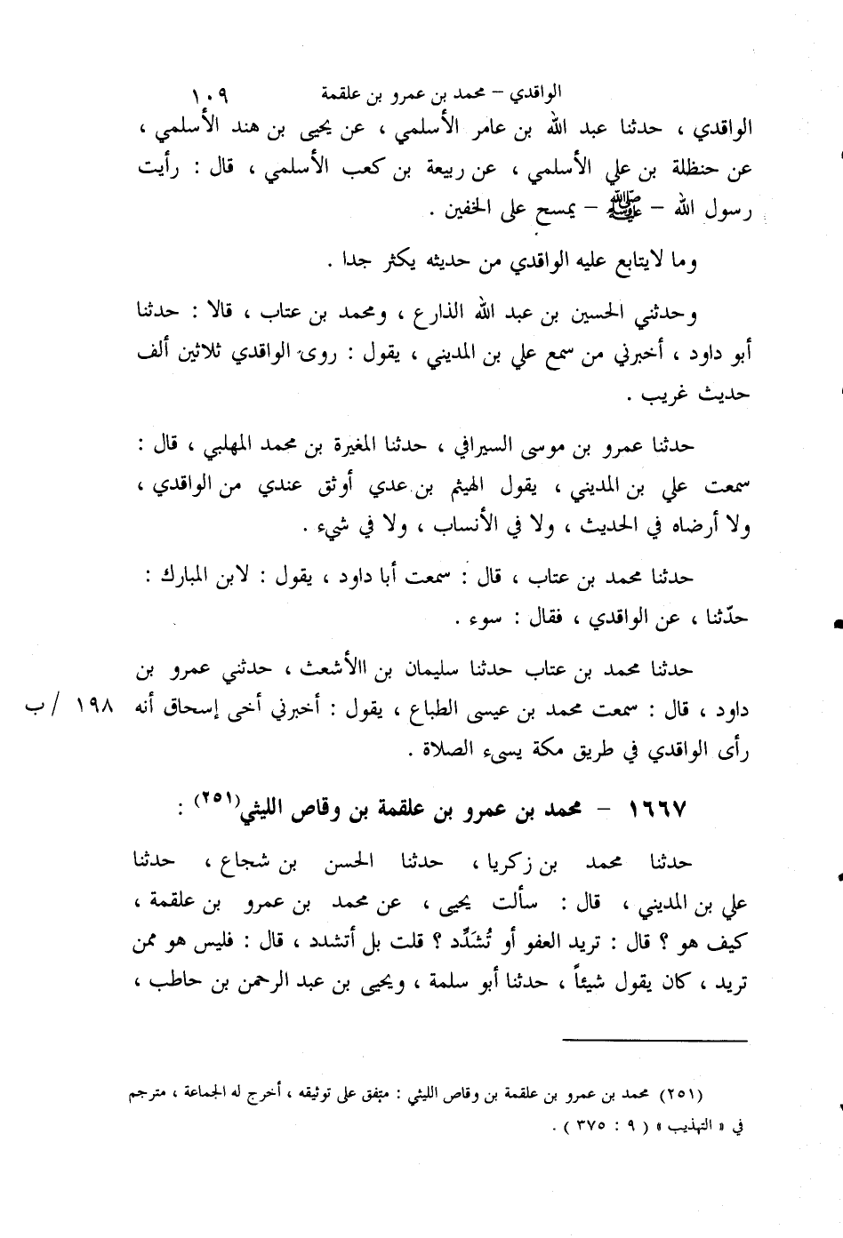 §1667 - مُحَمَّدُ بْنُ عَمْرِو بْنِ عَلْقَمَةَ بْنِ وَقَّاصٍ اللَّيْثِيُّ حَدَّثَنَا مُحَمَّدُ بْنُ زَكَرِيَّا، حَدَّثَنَا الْحَسَنُ بْنُ شُجَاعٍ، حَدَّثَنَا عَلِيُّ بْنُ الْمَدِينِيِّ قَالَ: سَأَلْتُ يَحْيَى، عَنْ مُحَمَّدِ بْنِ عَمْرِو بْنِ عَلْقَمَةَ، كَيْفَ هُوَ؟ قَالَ: تُرِيدُ الْعَفْوَ أَوْ تُشَدِّدُ؟ قُلْتُ: بَلْ أَتَشَدَّدُ , قَالَ: فَلَيْسَ هُوَ مِمَّنْ تُرِيدُ , كَانَ يَقُولُ شَيْئًا , حَدَّثَنَا أَبُو سَلَمَةَ وَيَحْيَى بْنُ عَبْدِ الرَّحْمَنِ بْنِ حَاطِبٍ , قَالَ: يَحْيَى وَسَأَلْتُ مَالِكَ بْنَ أَنَسٍ عَنْهُ , فَقَالَ: فِيهِ نَحْوًا مِمَّا قُلْتُ لَكَ , يَعْنِي مُحَمَّدَ بْنَ عَمْرٍو. حَدَّثَنَا مُحَمَّدُ بْنُ عِيسَى، حَدَّثَنَا الْعَبَّاسُ بْنُ مُحَمَّدٍ قَالَ: سَمِعْتُ يَحْيَى، يَقُولُ: مُحَمَّدُ بْنُ عَجْلَانَ أَوْثَقُ مِنْ مُحَمَّدِ بْنِ عَمْرٍو , وَلَمْ يَكُونُوا يَكْتُبُونَ حَدِيثَ مُحَمَّدِ بْنِ عَمْرٍو حَتَّى اشْتَهَاهَا أَصْحَابُ الْإِسْنَادِ فَكَتَبُوهَا , وَمُحَمَّدُ بْنُ عَمْرٍو أَحَبُّ إِلَيَّ مِنْ مُحَمَّدِ بْنِ إِسْحَاقَ