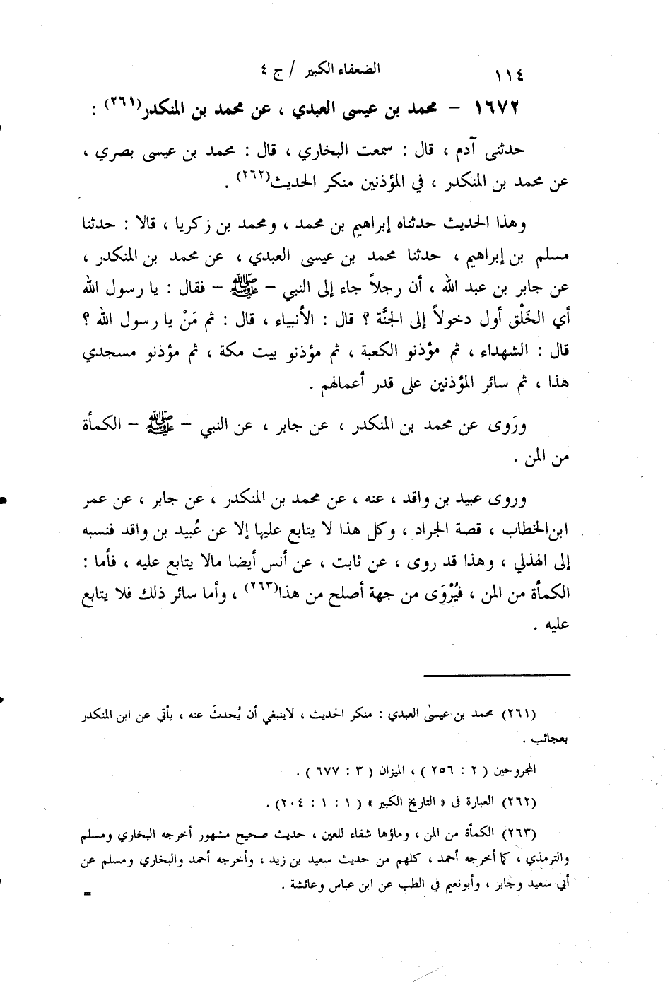 §1672 - مُحَمَّدُ بْنُ عِيسَى الْعَبْدِيُّ عَنْ مُحَمَّدِ بْنِ الْمُنْكَدِرِ. حَدَّثَنِي آدَمُ قَالَ: سَمِعْتُ الْبُخَارِيَّ قَالَ: مُحَمَّدُ بْنُ عِيسَى بَصْرِيٌّ , عَنْ مُحَمَّدِ بْنِ الْمُنْكَدِرِ، فِي الْمُؤَذِّنِينَ مُنْكَرُ الْحَدِيثِ