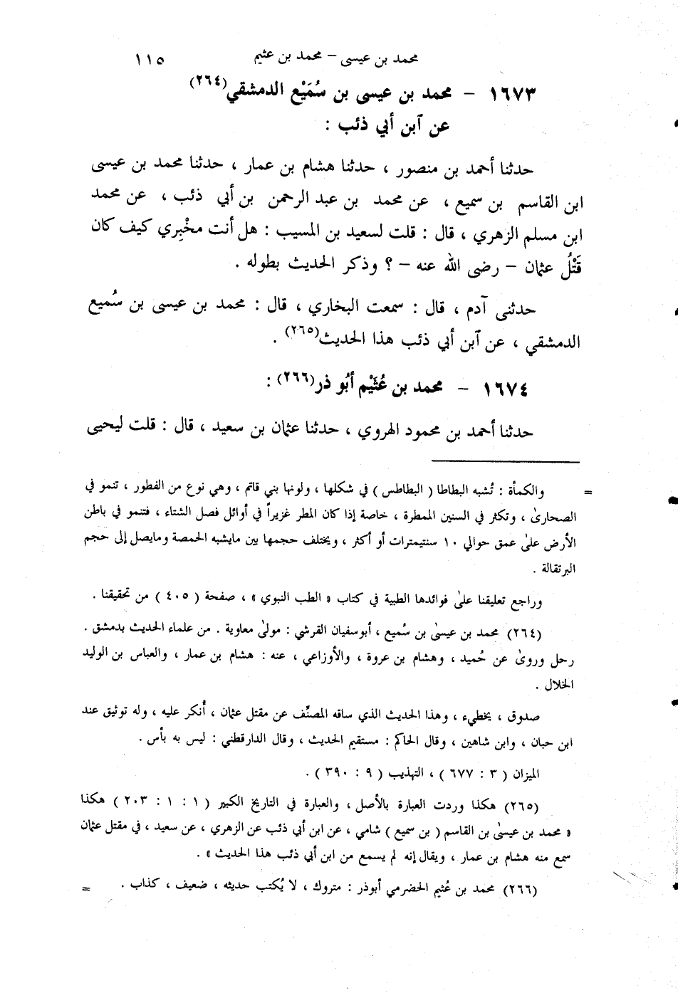§1673 - مُحَمَّدُ بْنُ عِيسَى بْنِ سُمَيْعٍ الدِّمَشْقِيُّ عَنِ ابْنِ أَبِي ذِئْبٍ، حَدَّثَنَا أَحْمَدُ بْنُ مَنْصُورٍ، حَدَّثَنَا هِشَامُ بْنُ عَمَّارٍ، حَدَّثَنَا مُحَمَّدُ بْنُ عِيسَى بْنِ الْقَاسِمِ بْنِ سُمَيْعٍ، عَنْ مُحَمَّدِ بْنِ عَبْدِ الرَّحْمَنِ بْنِ أَبِي ذِئْبٍ، عَنْ مُحَمَّدِ بْنِ مُسْلِمٍ الزُّهْرِيِّ قَالَ: قُلْتُ لِسَعِيدِ بْنِ الْمُسَيِّبِ: هَلْ أَنْتَ مُخْبِرِي كَيْفَ كَانَ قَتْلُ عُثْمَانَ رَضِيَ اللَّهُ عَنْهُ؟ وَذَكَرَ الْحَدِيثَ بِطُولِهِ. حَدَّثَنِي آدَمُ قَالَ: سَمِعْتُ الْبُخَارِيَّ قَالَ: مُحَمَّدُ بْنُ عِيسَى بْنِ سُمَيْعٍ الدِّمَشْقِيُّ , عَنِ ابْنِ أَبِي ذِئْبٍ، هَذَا الْحَدِيثُ
