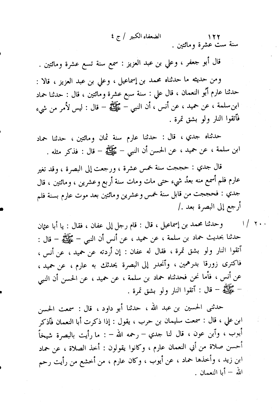 وَمِنْ حَدِيثِهِ مَا حَدَّثَنَاهُ مُحَمَّدُ بْنُ إِسْمَاعِيلَ، وَعَلِيُّ بْنُ عَبْدِ الْعَزِيزِ، قَالَا , حَدَّثَنَا عَارِمٌ أَبُو النُّعْمَانِ، قَالَ عَلِيٌّ: سَنَةَ سَبْعَ عَشْرَةَ وَمِائَتَيْنِ , قَالَ: حَدَّثَنَا حَمَّادُ بْنُ سَلَمَةَ , عَنْ حُمَيْدٍ , عَنْ أَنَسٍ أَنَّ النَّبِيَّ صَلَّى اللهُ عَلَيْهِ وَسَلَّمَ , قَالَ: §«لَيْسَ لِامْرِئٍ مِنْ شَيْءٍ , فَاتَّقُوا النَّارَ وَلَوْ بِشِقِّ تَمْرَةٍ» . حَدَّثَنَاهُ جَدِّي قَالَ: حَدَّثَنَا عَارِمٌ، سَنَةَ ثَمَانٍ وَمِائَتَيْنِ , حَدَّثَنَا حَمَّادُ بْنُ سَلَمَةَ، عَنْ حُمَيْدٍ، عَنِ الْحَسَنِ، أَنَّ النَّبِيَّ صَلَّى اللهُ عَلَيْهِ وَسَلَّمَ , قَالَ، فَذَكَرَ مِثْلَهُ. قَالَ: جَدِّي حَجَجْتُ سَنَةَ خَمْسَ عَشْرَةَ وَرَجَعْتُ إِلَى الْبَصْرَةِ , وَقَدْ تَغَيَّرَ عَارِمٌ , فَلَمْ أَسْمَعْ مِنْهُ بَعْدُ شَيْئًا حَتَّى مَاتَ , وَمَاتَ سَنَةَ أَرْبَعٍ وَعِشْرِينَ وَمِائَتَيْنِ , قَالَ: جَدِّي فَحَجَجْتُ مِنْ قَابِلِ سَنَةِ خَمْسٍ وَعِشْرِينَ وَمِائَتَيْنِ , بَعْدَ مَوْتِ عَارِمٍ بِسَنَةٍ , فَلَمْ أَرْجِعْ إِلَى الْبَصْرَةِ بَعْدُ وَحَدَّثَنَا مُحَمَّدُ بْنُ إِسْمَاعِيلَ قَالَ: قَامَ رَجُلٌ إِلَى عَفَّانَ , فَقَالَ: يَا أَبَا عُثْمَانَ , حَدِّثْنَا بِحَدِيثِ حَمَّادِ بْنِ سَلَمَةَ , عَنْ حُمَيْدٍ , عَنْ أَنَسٍ أَنَّ النَّبِيَّ صَلَّى اللهُ عَلَيْهِ وَسَلَّمَ , قَالَ: اتَّقُوا النَّارَ وَلَوْ بِشِقِّ تَمْرَةٍ , فَقَالَ لَهُ عَفَّانُ: إِنْ أَرَدْتَهُ , عَنْ حُمَيْدٍ , عَنْ أَنَسٍ , فَاكْتَرِي زَوْرَقًا بِدِرْهَمَيْنِ وَانْحَدِرْ إِلَى الْبَصْرَةِ , يُحَدِّثْكَ بِهِ عَارِمٌ , عَنْ حُمَيْدٍ , عَنْ أَنَسٍ , فَأَمَّا نَحْنُ فَحَدَّثَنَاهُ حَمَّادُ بْنُ سَلَمَةَ , عَنْ حُمَيْدٍ عَنِ الْحَسَنِ أَنَّ النَّبِيَّ صَلَّى اللهُ عَلَيْهِ وَسَلَّمَ , قَالَ: اتَّقُوا النَّارَ وَلَوْ بِشِقِّ تَمْرَةٍ حَدَّثَنِي الْحُسَيْنُ بْنُ عَبْدِ اللَّهِ، حَدَّثَنَا أَبُو دَاوُدَ قَالَ: سَمِعْتُ الْحَسَنَ بْنَ عَلِيٍّ قَالَ: سَمِعْتُ سُلَيْمَانَ بْنَ حَرْبٍ، يَقُولُ إِذَا ذَكَرْتَ أَبَا النُّعْمَانِ فَاذْكُرْ أَيُّوبَ وَابْنَ عَوْنٍ , قَالَ لَنَا جَدِّي , رَحِمَهُ اللَّهُ: مَا رَأَيْتُ بِالْبَصْرَةِ شَيْخًا أَحْسَنَ صَلَاةً مِنْ أَبِي النُّعْمَانِ عَارِمٍ , وَكَانُوا يَقُولُونَ أَخَذَ الصَّلَاةَ , عَنْ حَمَّادِ بْنِ زَيْدٍ وَأَخَذَهَا حَمَّادٌ , عَنْ أَيُّوبَ، وَكَانَ عَارِمٌ مِنْ أَخْشَعِ مَنْ رَأَيْتُ رَحِمَ اللَّهُ أَبَا النُّعْمَانِ