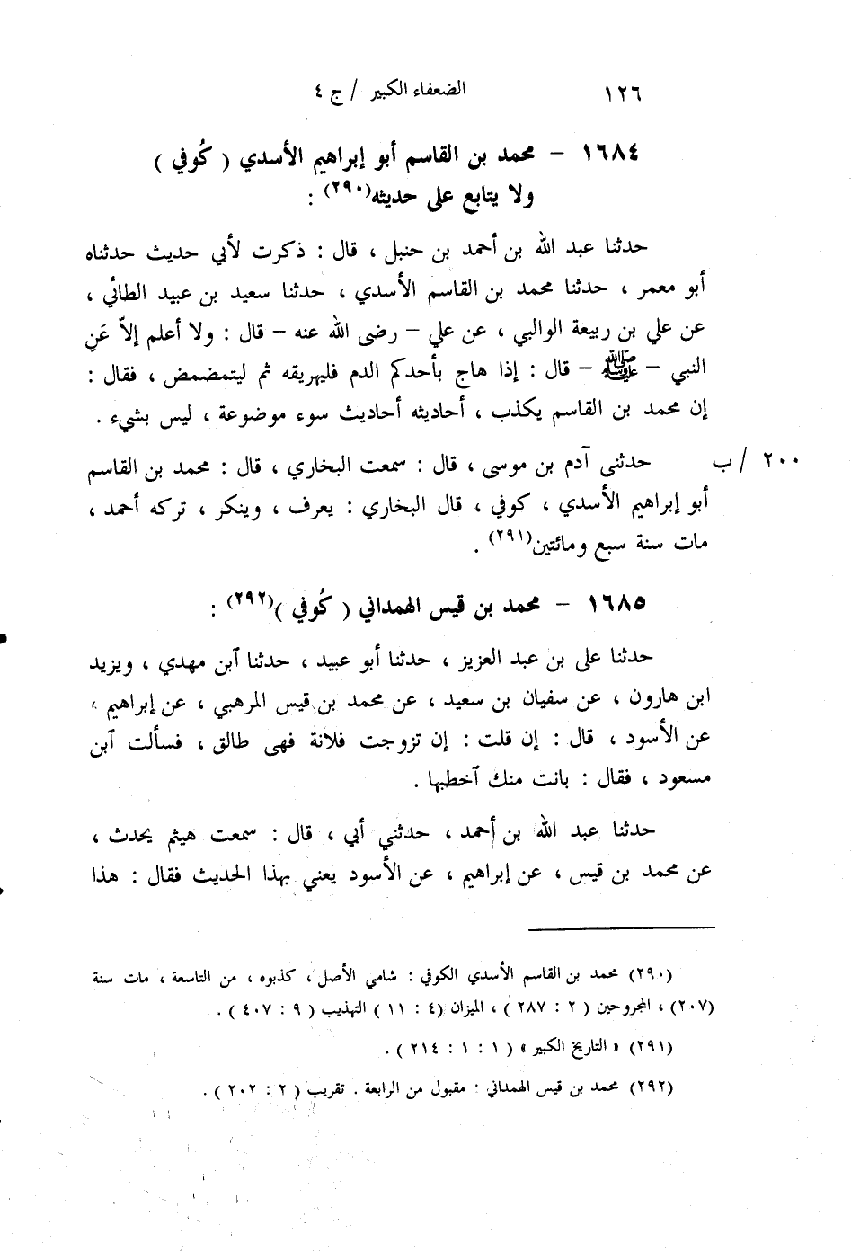 §1684 - مُحَمَّدُ بْنُ الْقَاسِمِ أَبُو إِبْرَاهِيمَ الْأَسَدِيُّ كُوفِيٌّ وَلَا يُتَابَعُ عَلَى حَدِيثِهِ. حَدَّثَنَا عَبْدُ اللَّهِ بْنُ أَحْمَدَ بْنِ حَنْبَلٍ قَالَ: ذَكَرْتُ لِأَبِي حَدِيثًا , حَدَّثَنَاهُ أَبُو مَعْمَرٍ، حَدَّثَنَا مُحَمَّدُ بْنُ الْقَاسِمِ الْأَسَدِيُّ، حَدَّثَنَا سَعِيدُ بْنُ عُبَيْدٍ الطَّائِيُّ، عَنْ عَلِيِّ بْنِ رَبِيعَةَ الْوَالِبِيِّ، عَنْ عَلِيٍّ، رَضِيَ اللَّهُ عَنْهُ , قَالَ: وَلَا أَعْلَمُ إِلَّا عَنِ النَّبِيِّ صَلَّى اللهُ عَلَيْهِ وَسَلَّمَ , قَالَ: «إِذَا هَاجَ بِأَحَدِكُمُ الدَّمُ فَلْيُهْرِقْهُ ثُمَّ لِيَتَمَضْمَضْ» , فَقَالَ: إِنَّ مُحَمَّدَ بْنَ الْقَاسِمِ يَكْذِبُ , أَحَادِيثُهُ أَحَادِيثُ سُوءٍ مَوْضُوعَةٌ لَيْسَ بِشَيْءٍ. حَدَّثَنِي آدَمُ بْنُ مُوسَى قَالَ: سَمِعْتُ الْبُخَارِيَّ قَالَ: مُحَمَّدُ بْنُ الْقَاسِمِ أَبُو إِبْرَاهِيمَ الْأَسَدِيُّ كُوفِيٌّ , قَالَ الْبُخَارِيُّ: يَعْرِفُ وَيَنْكُرُ , تَرَكَهُ أَحْمَدُ , مَاتَ سَنَةَ سَبْعٍ وَمِائَتَيْنِ
