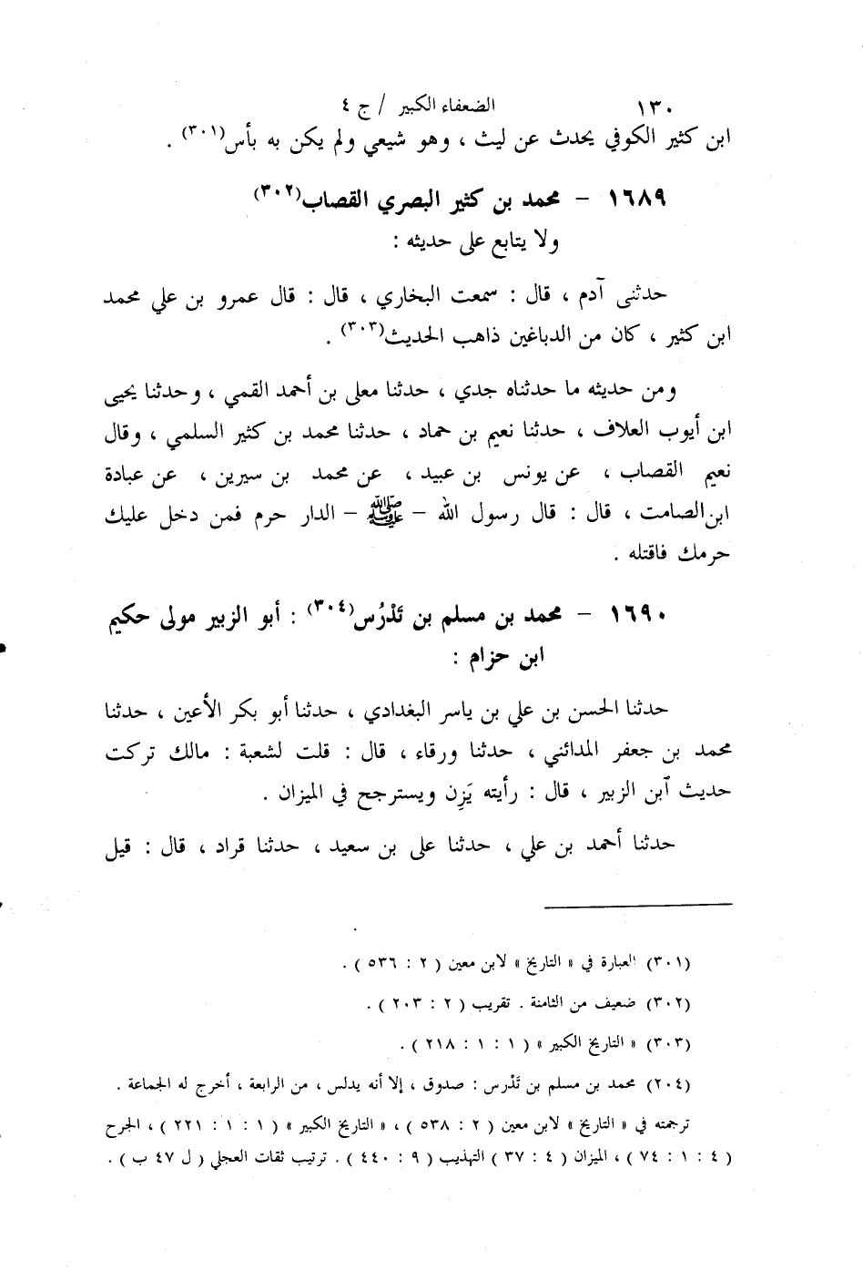 §1689 - مُحَمَّدُ بْنُ كَثِيرٍ الْبَصْرِيُّ الْقَصَّابُ وَلَا يُتَابَعُ عَلَى حَدِيثِهِ. حَدَّثَنِي آدَمُ قَالَ: سَمِعْتُ الْبُخَارِيَّ قَالَ: قَالَ عَمْرُو بْنُ عَلِيٍّ: مُحَمَّدُ بْنُ كَثِيرٍ كَانَ مِنَ الدَّبَّاغِينَ، ذَاهِبُ الْحَدِيثِ
