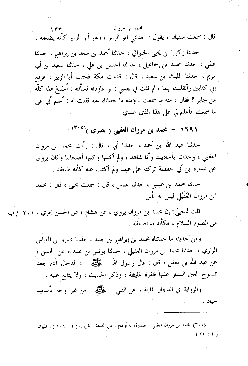 §1691 - مُحَمَّدُ بْنُ مَرْوَانَ الْعُقَيْلِيُّ بَصْرِيٌّ حَدَّثَنَا عَبْدُ اللَّهِ بْنُ أَحْمَدَ، حَدَّثَنَا أَبِي قَالَ: رَأَيْتُ مُحَمَّدَ بْنَ مَرْوَانَ الْعُقَيْلِيَّ وَحَدَّثَ بِأَحَادِيثَ وَأَنَا شَاهِدٌ وَلَمْ أَكْتُبْهَا , وَكَتَبَهَا أَصْحَابُنَا , وَكَانَ يَرْوِي عَنْ عُمَارَةَ بْنَ أَبِي حَفْصَةَ , تَرَكْتُهُ عَلَى عَمْدٍ وَلَمْ أَكْتُبْ عَنْهُ كَأَنَّهُ ضَعَّفَهُ. حَدَّثَنَا مُحَمَّدُ بْنُ عِيسَى، حَدَّثَنَا عَبَّاسٌ قَالَ: سَمِعْتُ يَحْيَى قَالَ: مُحَمَّدُ بْنُ مَرْوَانَ الْعُقَيْلِيُّ لَيْسَ بِهِ بَأْسٌ , قُلْتُ لِيَحْيَى: إِنَّ مُحَمَّدَ بْنَ مَرْوَانَ يَرْوِي , عَنْ هِشَامٍ، عَنِ الْحَسَنِ , يَجْزِي مِنَ الصَّوْمِ السَّلَامُ , فَكَأَنَّهُ يَسْتَضْعِفُهُ
