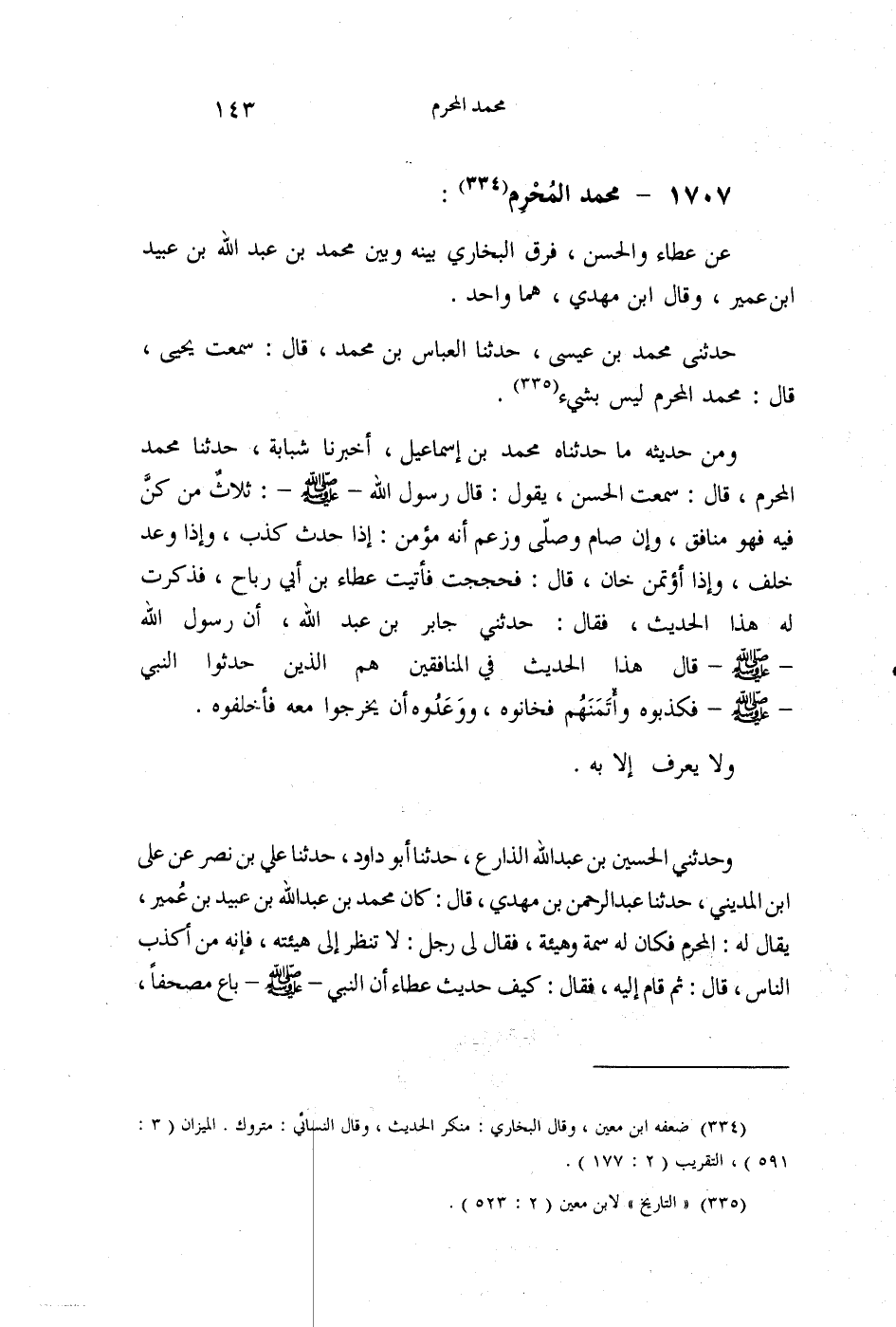 §1707 - مُحَمَّدٌ الْمُحْرِمُ عَنْ عَطَاءٍ، وَالْحَسَنِ، فَرَّقَ الْبُخَارِيُّ بَيْنَهُ وَبَيْنَ مُحَمَّدِ بْنِ عَبْدِ اللَّهِ بْنِ عُبَيْدِ بْنِ عُمَيْرٍ , وَقَالَ ابْنُ مَهْدِيٍّ: هُمَا وَاحِدٌ. حَدَّثَنِي مُحَمَّدُ بْنُ عِيسَى، حَدَّثَنَا الْعَبَّاسُ بْنُ مُحَمَّدٍ قَالَ: سَمِعْتُ يَحْيَى قَالَ: مُحَمَّدٌ الْمُحْرِمُ لَيْسَ بِشَيْءٍ