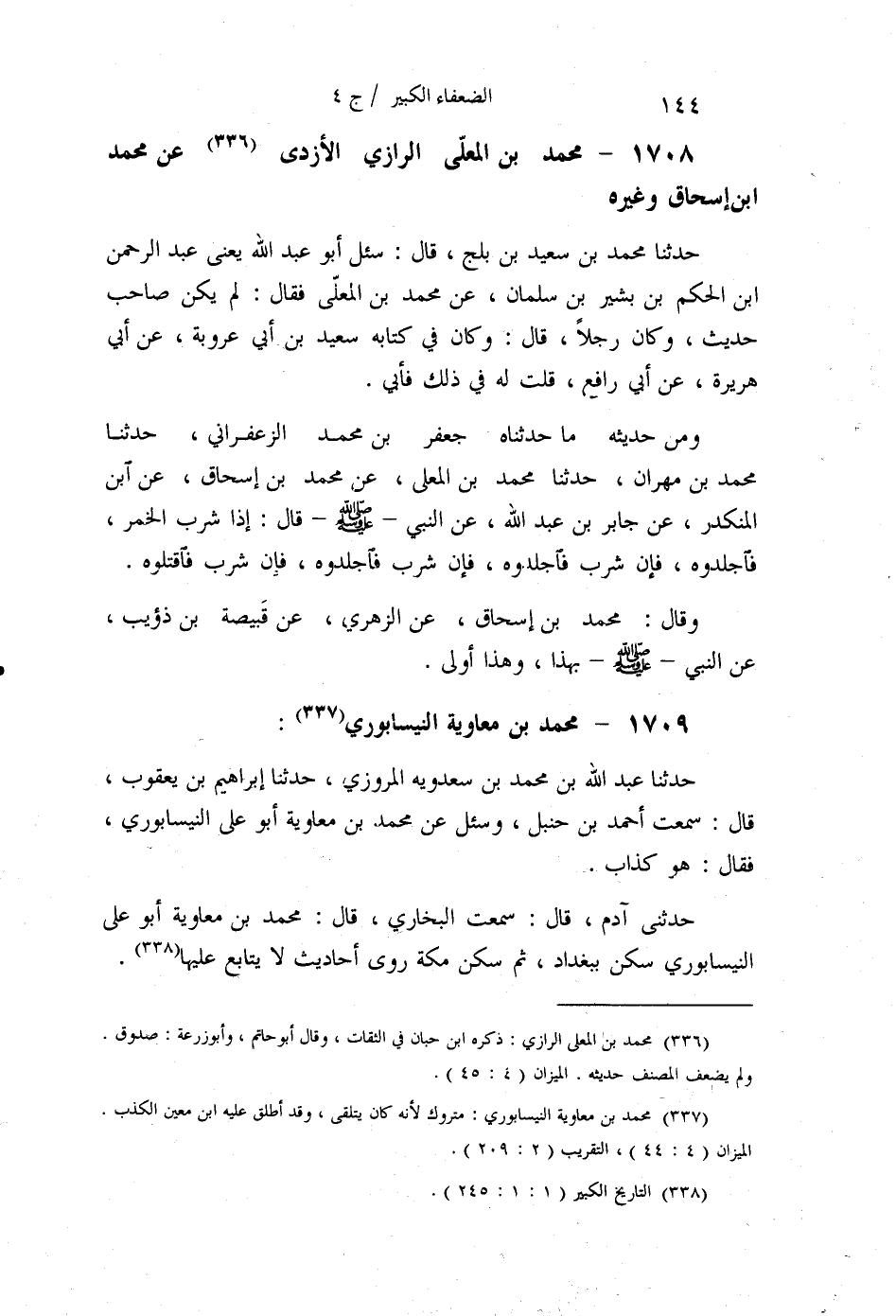 §1709 - مُحَمَّدُ بْنُ مُعَاوِيَةَ النَّيْسَابُورِيُّ حَدَّثَنَا عَبْدُ اللَّهِ بْنُ مُحَمَّدِ بْنِ سَعْدَوَيْهِ الْمَرْوَزِيُّ، حَدَّثَنَا إِبْرَاهِيمُ بْنُ يَعْقُوبَ قَالَ: سَمِعْتُ أَحْمَدَ بْنَ حَنْبَلٍ، وَسُئِلَ عَنْ مُحَمَّدِ بْنِ مُعَاوِيَةَ أَبِي عَلِيٍّ النَّيْسَابُورِيِّ، فَقَالَ: هُوَ كَذَّابٌ. حَدَّثَنِي آدَمُ قَالَ: سَمِعْتُ الْبُخَارِيَّ قَالَ: مُحَمَّدُ بْنُ مُعَاوِيَةَ أَبُو عَلِيٍّ النَّيْسَابُورِيِّ سَكَنَ بِبَغْدَادَ , ثُمَّ سَكَنَ مَكَّةَ رَوَى أَحَادِيثَ لَا يُتَابَعُ عَلَيْهَا