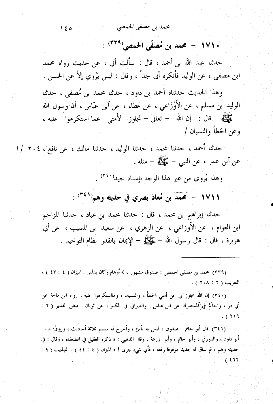 §1710 - مُحَمَّدُ بْنُ مُصَفًّى الْحِمْصِيُّ حَدَّثَنَا عَبْدُ اللَّهِ بْنُ أَحْمَدَ قَالَ: سَأَلْتُ أَبِي عَنْ حَدِيثٍ، رَوَاهُ مُحَمَّدُ بْنُ مُصَفًّى عَنِ الْوَلِيدِ، فَأَنْكَرَهُ أَبِي جِدًّا , وَقَالَ: لَيْسَ يَرْوِي إِلَّا عَنِ الْحَسَنِ