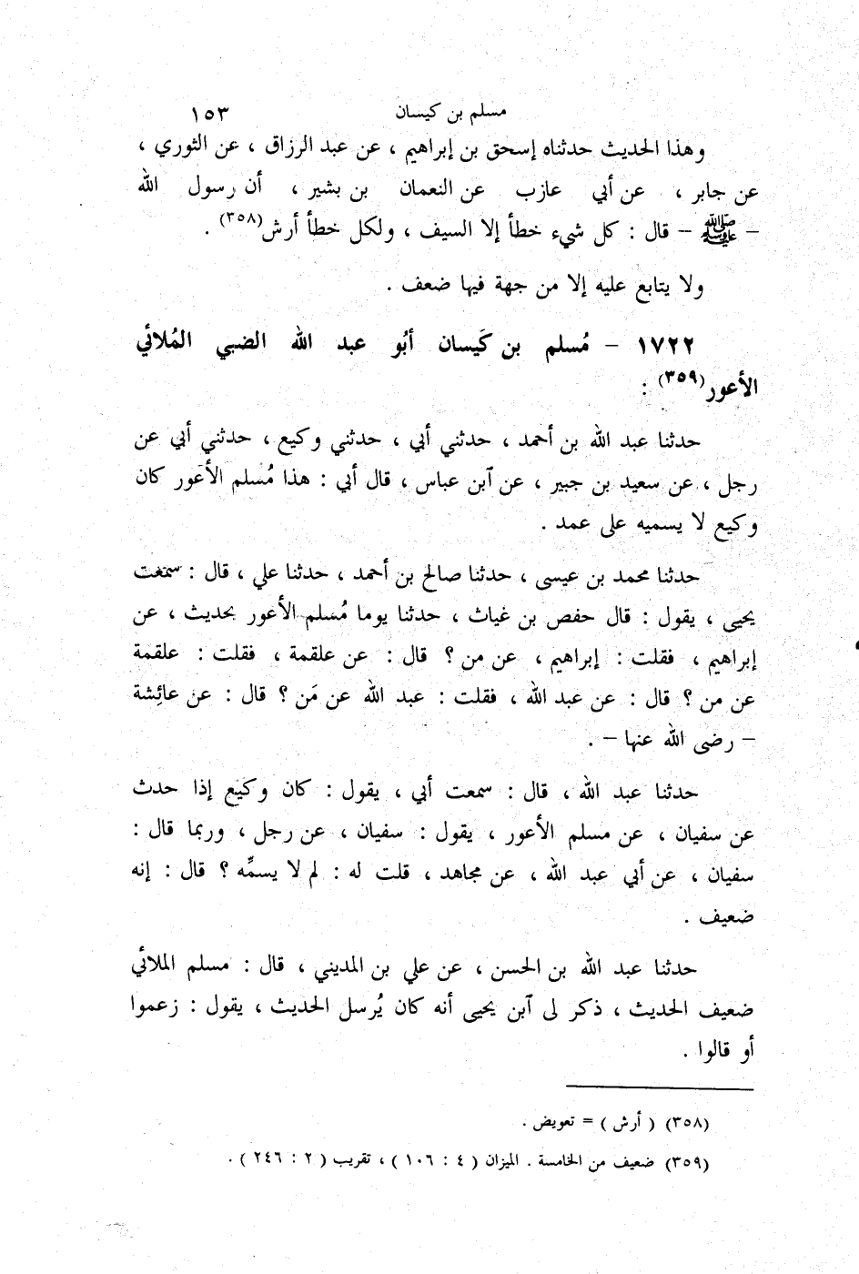 §1722 - مُسْلِمُ بْنُ كَيْسَانَ أَبُو عَبْدِ اللَّهِ الضَّبِّيُّ الْمُلَائِيُّ الْأَعْوَرُ حَدَّثَنَا عَبْدُ اللَّهِ بْنُ أَحْمَدَ، حَدَّثَنِي أَبِي، حَدَّثَنِي وَكِيعٌ، حَدَّثَنِي أَبِي، عَنْ رَجُلٍ، عَنْ سَعِيدِ بْنِ جُبَيْرٍ، عَنِ ابْنِ عَبَّاسٍ، قَالَ أَبِي: هَذَا مُسْلِمٌ الْأَعْوَرُ كَانَ وَكِيعٌ لَا يُسَمِّيهِ عَلَى عَمْدٍ. حَدَّثَنَا مُحَمَّدُ بْنُ عِيسَى، حَدَّثَنَا صَالِحُ بْنُ أَحْمَدَ، حَدَّثَنَا عَلِيٌّ قَالَ: سَمِعْتُ يَحْيَى يَقُولُ: قَالَ حَفْصُ بْنُ غِيَاثٍ: حَدَّثَنَا يَوْمًا مُسْلِمٌ الْأَعْوَرُ بِحَدِيثٍ عَنْ إِبْرَاهِيمَ، فَقُلْتُ: إِبْرَاهِيمُ عَنْ مَنْ؟ قَالَ: عَنْ عَلْقَمَةَ، فَقُلْتُ: عَلْقَمَةُ عَنْ مَنْ؟ قَالَ: عَنْ عَبْدِ اللَّهِ، فَقُلْتُ: عَبْدُ اللَّهِ عَنْ مَنْ؟ قَالَ: عَنْ عَائِشَةَ، رَضِيَ اللَّهُ عَنْهَا. حَدَّثَنَا عَبْدُ اللَّهِ قَالَ: سَمِعْتُ أَبِي يَقُولُ: كَانَ وَكِيعٌ إِذَا حَدَّثَ عَنْ سُفْيَانَ، عَنْ مُسْلِمٍ الْأَعْوَرِ يَقُولُ: سُفْيَانُ , عَنْ رَجُلٍ، وَرُبَّمَا قَالَ: سُفْيَانُ عَنْ أَبِي عَبْدِ اللَّهِ، عَنْ مُجَاهِدٍ، قُلْتُ لَهُ: لِمَ لَا يُسَمِّهِ؟ قَالَ: إِنَّهُ ضَعِيفٌ. حَدَّثَنَا عَبْدُ اللَّهِ بْنُ الْحَسَنِ، عَنْ عَلِيِّ بْنِ الْمَدِينِيِّ قَالَ: مُسْلِمُ الْمُلَائِيُّ ضَعِيفُ الْحَدِيثِ , ذَكَرَ لِيَ ابْنُ يَحْيَى أَنَّهُ كَانَ يُرْسِلُ الْحَدِيثَ , يَقُولُ: زَعَمُوا أَوْ قَالُوا. حَدَّثَنِي مُحَمَّدُ بْنُ عِيسَى، حَدَّثَنَا عَمْرُو بْنُ عَلِيٍّ قَالَ: كَانَ يَحْيَى وَعَبْدُ الرَّحْمَنِ لَا يُحَدِّثَانِ , عَنْ مُسْلِمٍ الْأَعْوَرِ , وَهُوَ مُسْلِمٌ أَبُو عَبْدِ اللَّهِ , وَكَانَ شُعْبَةُ وَسُفْيَانُ يُحَدِّثَانِ عَنْهُ , وَهُوَ مُنْكَرُ الْحَدِيثِ جِدًّا. حَدَّثَنَا مُحَمَّدُ بْنُ زَكَرِيَّا الْبَلْخِيُّ، حَدَّثَنَا مُحَمَّدُ بْنُ الْمُثَنَّى قَالَ: مَا سَمِعْتُ يَحْيَى، وَلَا عَبْدَ الرَّحْمَنِ يُحَدِّثَانِ عَنْ سُفْيَانَ، عَنْ مُسْلِمٍ الْأَعْوَرِ الْمُلَائِيِّ، شَيْئًا قَطُّ. حَدَّثَنَا عَبْدُ اللَّهِ قَالَ: سَأَلْتُ أَبِي عَنْ مُسْلِمٍ الْأَعْوَرِ، فَقَالَ: ضَعِيفُ الْحَدِيثِ , لَا يُكْتَبُ حَدِيثَهُ. حَدَّثَنَا عَبْدُ اللَّهِ قَالَ: قِيلَ لِأَبِي وَأَنَا أَسْمَعُ: مُسْلِمٌ الْأَعْوَرُ؟ فَقَالَ: هُوَ دُونَ هَؤُلَاءِ , يَعْنِي دُونَ عَطَاءِ بْنِ السَّائِبِ , وَلَيْثٍ , وَيَزِيدَ بْنِ أَبِي زِيَادٍ , وَثَوْرِ بْنِ أَبِي فَاخِتَةَ. حَدَّثَنَا مُحَمَّدُ بْنُ أَحْمَدَ، حَدَّثَنَا مُعَاوِيَةُ بْنُ صَالِحٍ قَالَ: سَمِعْتُ يَحْيَى، يَقُولُ: مُسْلِمٌ الْمُلَائِيُّ الْأَعْوَرُ كُوفِيٌّ لَيْسَ بِثِقَةٍ. حَدَّثَنِي آدَمُ قَالَ: سَمِعْتُ الْبُخَارِيَّ قَالَ: مُسْلِمُ بْنُ كَيْسَانَ أَبُو عَبْدِ اللَّهِ الضَّبِّيُّ يَتَكَلَّمُونَ فِيهِ