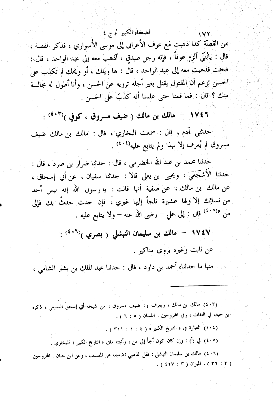 §1746 - مَالِكُ بْنُ مَالِكٍ , ضَيْفُ مَسْرُوقٍ كُوفِيٌّ حَدَّثَنِي آدَمُ قَالَ: سَمِعْتُ الْبُخَارِيَّ قَالَ: مَالِكُ بْنُ مَالِكٍ , ضَيْفُ مَسْرُوقٍ لَمْ يُعْرَفْ إِلَّا بِهَذَا , وَلَمْ يُتَابَعْ عَلَيْهِ